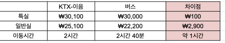 정리해보면, KTX-이음의 경우 특실을 탑승하고 버스의 경우 프리미엄 버스를 탈 때 가격 차이는 100원이다. (적립금 제외)