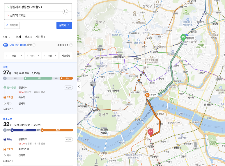 KTX-이음으로 청량리역에 도착 후 신사역까지 지하철로 이동하면 지하철 교통비 1,250원이 추가되고 이동시간 약 30분이 추가된다.