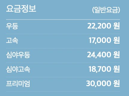 이제 비용을 따져보면 버스의 경우 우등이 22,200원이다. 일반 고속버스는 양쪽에 2열씩 자리가 배치된, 약간 옛날식 버스라서 요즘에는 선호되지는 않는것 같다. 심야에는 할증이 붙고 프리미엄의 경우 가격이 3만원으로 KTX-이음과 가격차이가 사실상 없다. (100원 차이)