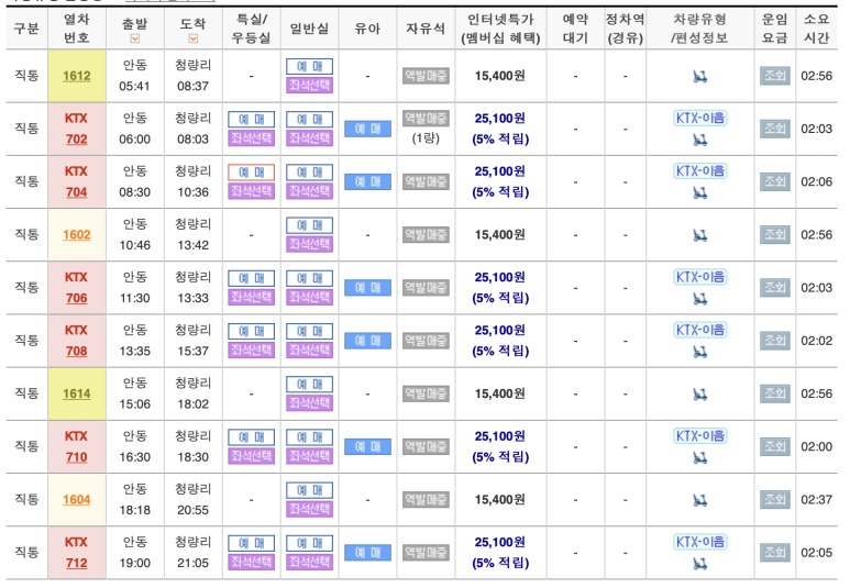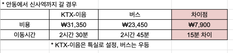 안동 → 서울, KTX-이음 vs 버스 비교