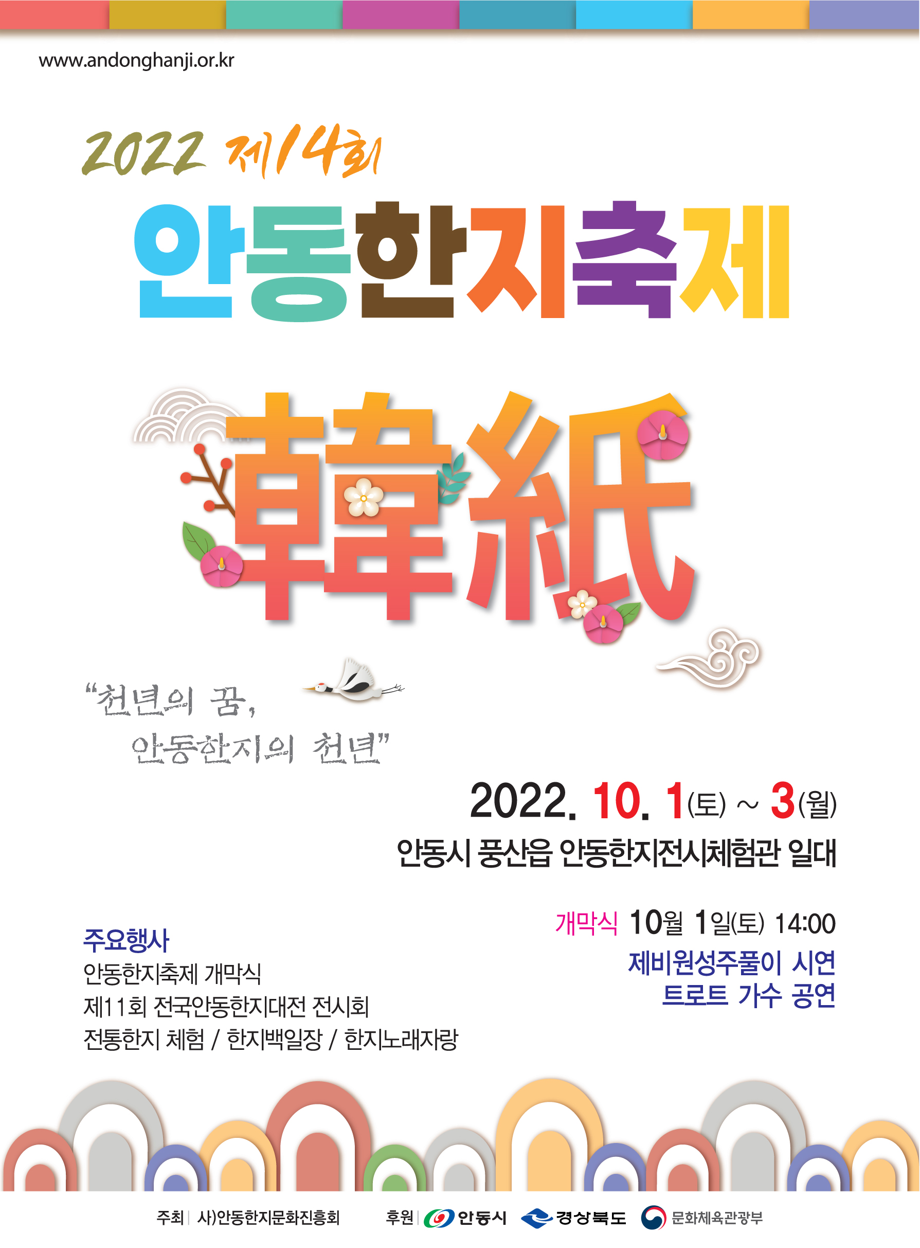 2022 제 14회 안동한지축제가 2022년 10월 1일~3일(토~월) 오전 10시부터 오후 5시까지 운영됩니다!