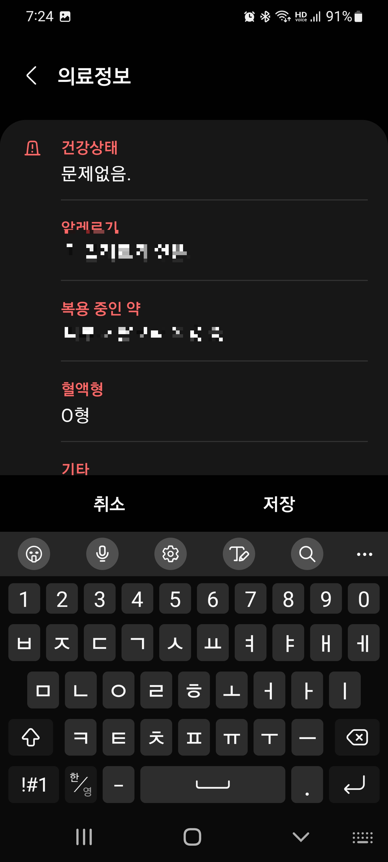 위 이미지처럼 대충 이런식으로 혈액형을 비롯해 기타 사항, 알레르기 현황, 복욕중인 약, 건강 상태 등을 간단하게 적어주면 되겠습니다.
