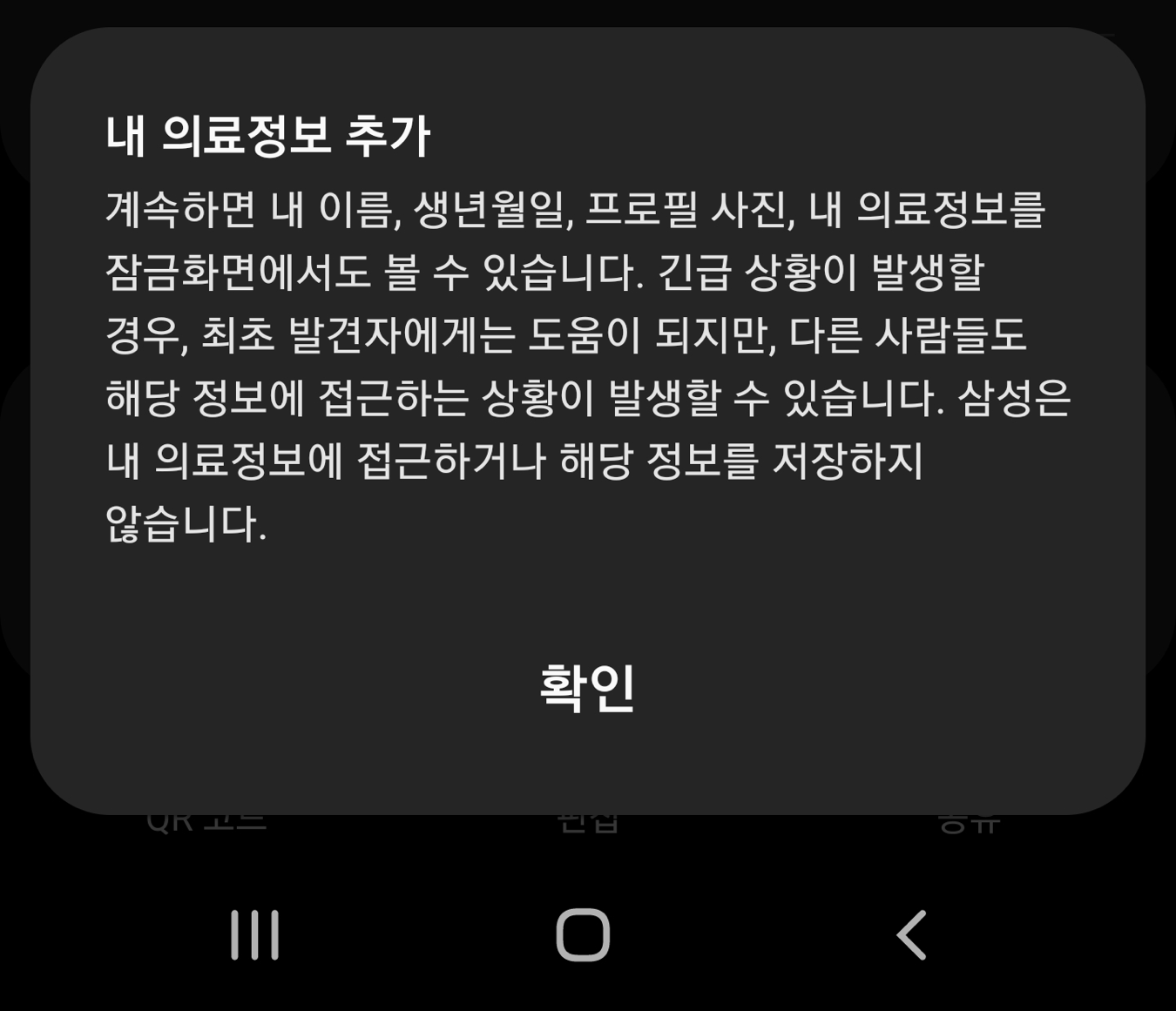 의료정보를 추가하면 잠금화면에서도 다른 사람이 나의 의료정보 등을 확인할 수 있습니다. 긴급 상황이 발생할 경우 최초 발견자에게는 도움이 될 수 있지만 다른 사람들이 내 정보에 접근할 수 있으므로 신중하게 설정해야하는데요. 저는 다른 사람이 볼 수 있다고 하더라도, 응급상황이 발생했을 때 더 빨리 조치를 받는게 좋다고 봅니다.