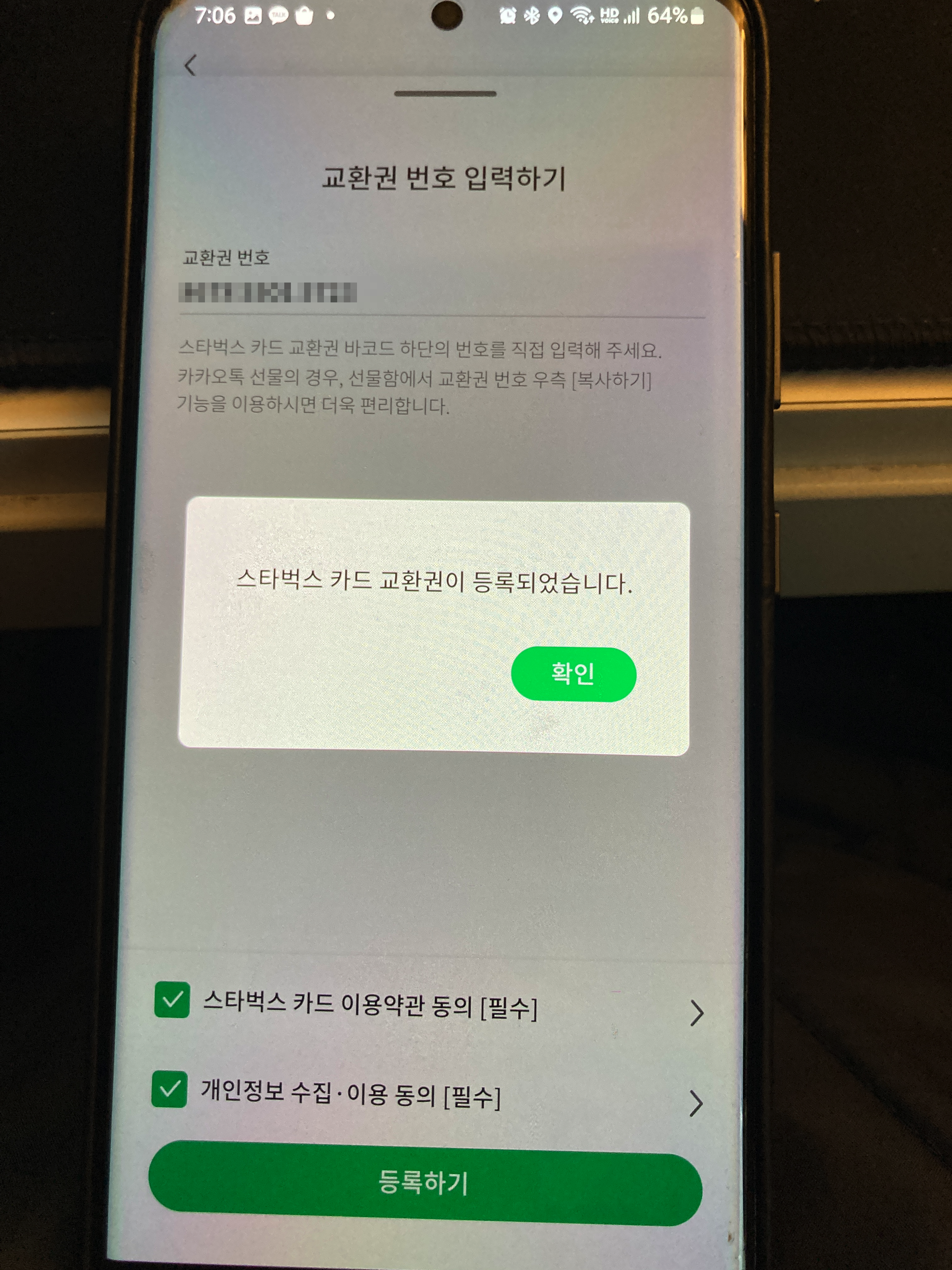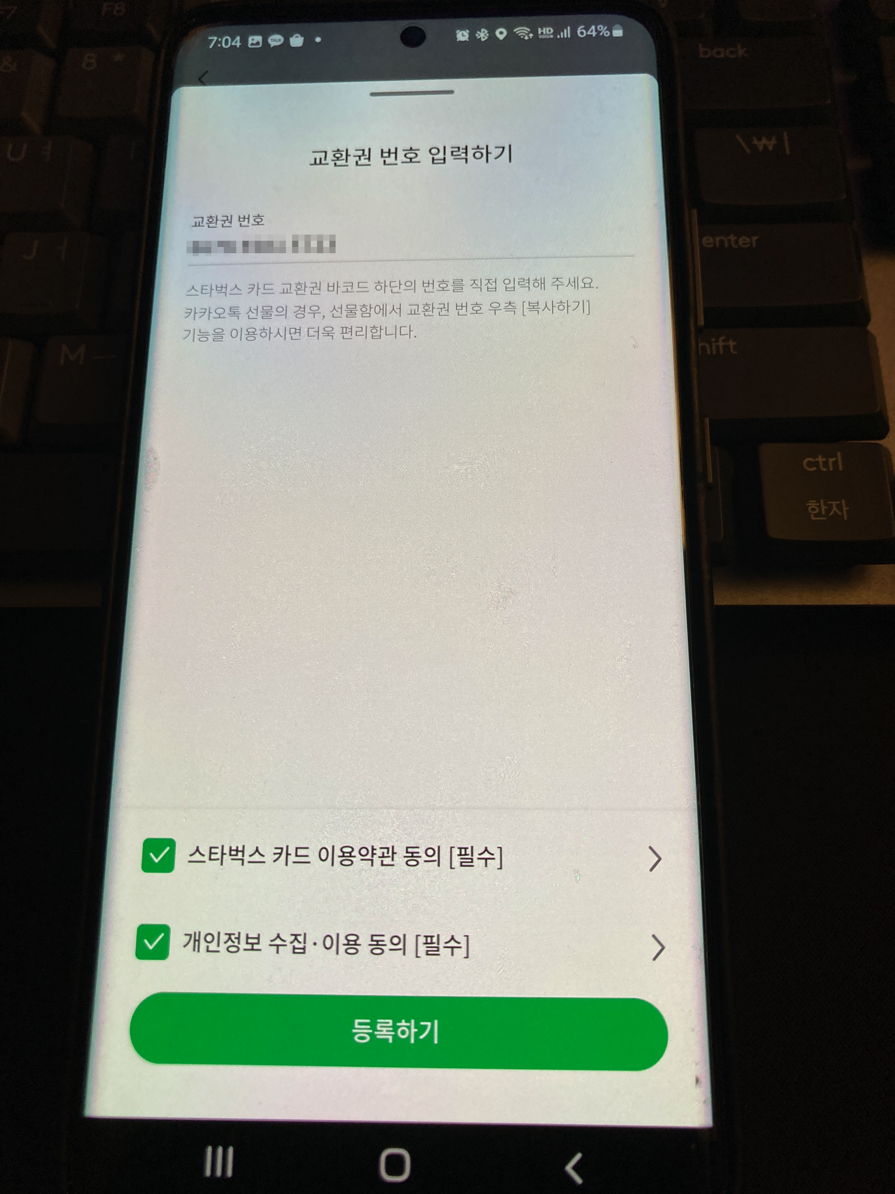 이렇게 받은 스타벅스 상품권은 바코드와 번호가 있습니다. 스타벅스 앱에 등록할 때 바코드로 등록하거나 번호를 입력해서 등록할 수 있습니다.