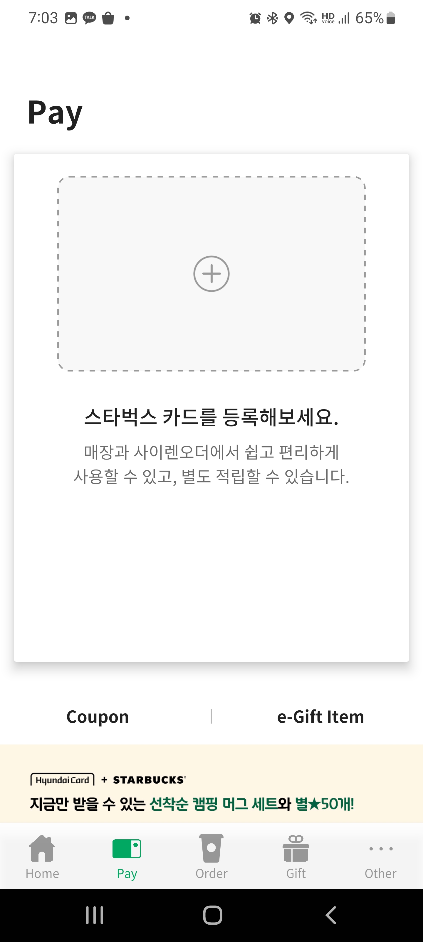 스타벅스 앱에서 첫 화면에 나오는 카드등록 버튼을 누르거나 아래쪽 메뉴에서 pay 버튼을 누릅니다. 이후 카드등록 창이 나오면 클릭해서 카드를 등록해줍니다. 그런 다음 교환권 번호 입력하기로 번호를 입력해줍니다.