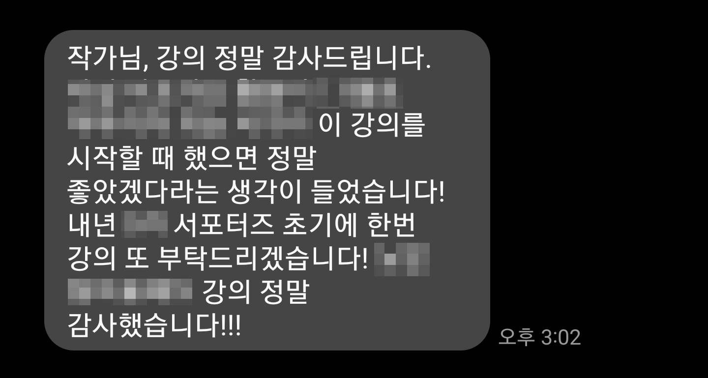 강의가 끝나고 담당자 선생님께서 후기 문자도 보내주셔서 기쁜 강의 시간이었습니다. 제 강의가 서포터즈분들을 비롯해 앞으로도 해당 재단의 훌륭한 콘텐츠 제작으로 이어질 수 있길 소망합니다.