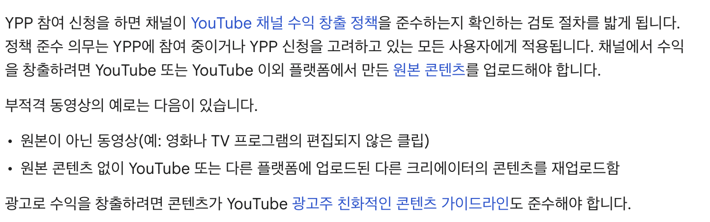 자신만의 콘텐츠를 가지고 있는게 좋습니다. 원본이 아닌 동영상이나 원본 콘텐츠 없이 다른 크리에이터의 콘텐츠를 재업로드 하는 식의 영상은 부적격 영상으로 취급한다고 합니다.