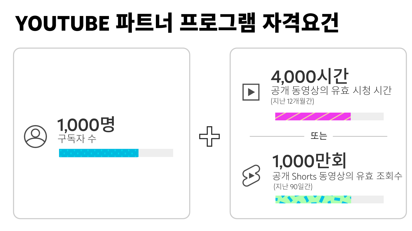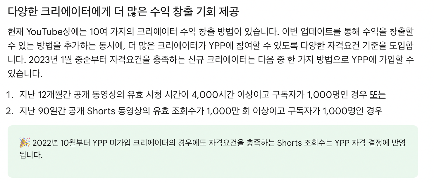 세부적인 내용을 살펴보면, 우선 기존에 (롱폼 영상)수익창출 조건은 그대로 유지됩니다. 최근 1년간 유효 시청 시간이 4000시간 이상이고 구독자가 1000명 이상인 경우, YPP(유튜브 파트너 프로그램)에 가입 후 수익창출을 할 수 있습니다.