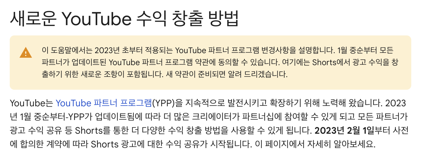 최근 크게 관심을 받고 있는 유튜브 쇼츠 수익창출에 대한 세부적인 내용이 공식적으로 나왔습니다. 이름은 새로운 유튜브 수익 창출 방법이라고 하고요. 2023년 초부터 유튜브 파트너 프로그램 변경으로 2023년 1월 중순부터는 새로운 유튜브 파트너 프로그램 약관에 동의한 후 쇼츠에서 광고 수익을 창출하는 준비를 할 수 있다고 합니다.