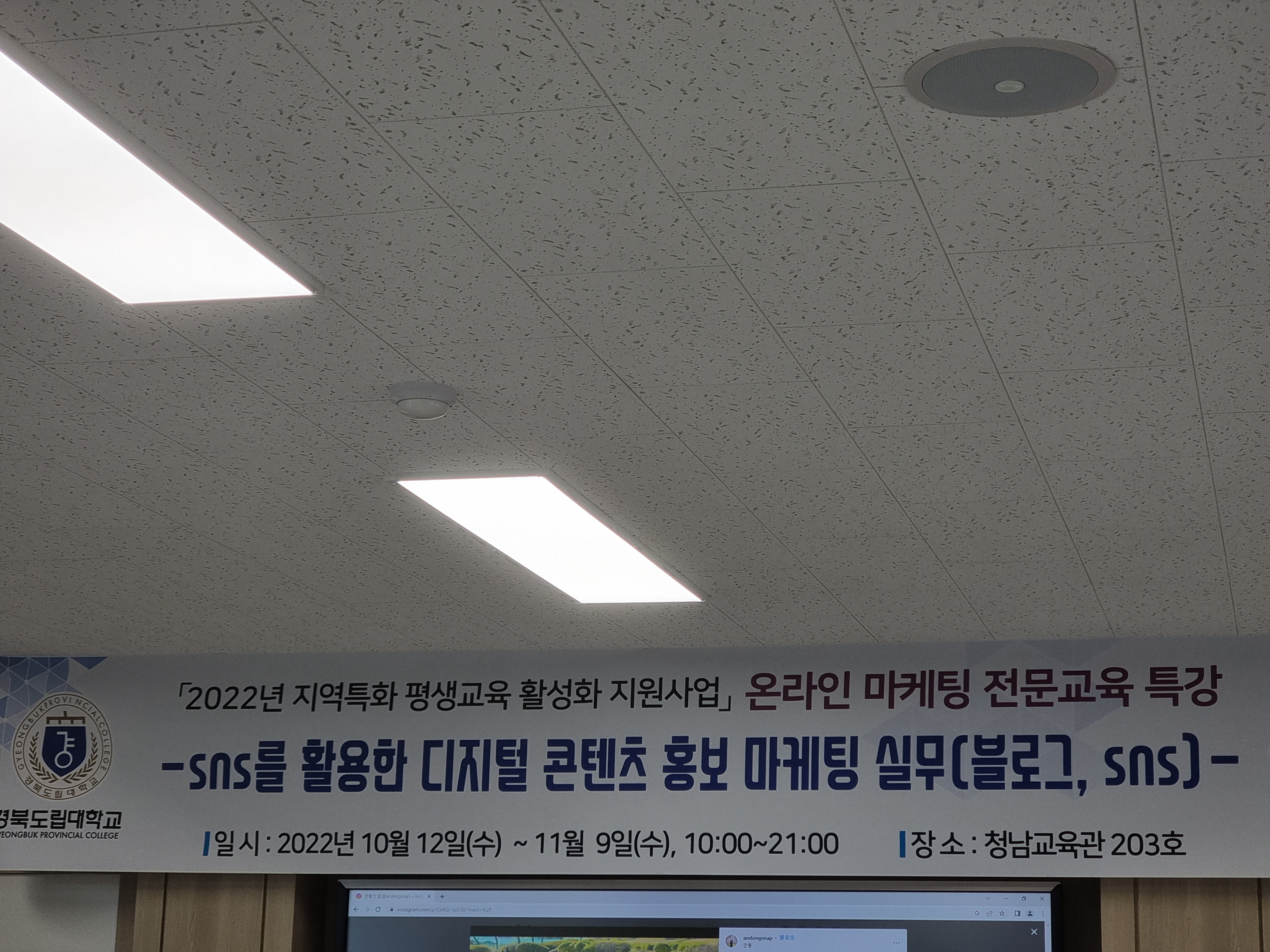 온라인 마케팅 전문교육 특강으로 SNS를 활용한 디지털 콘텐츠 홍보 마케팅 실무 교육을 다녀왔습니다. 경북도립대학교 청남교육관에서 5회동안 진행된 강의였습니다. 예비 창업자분들과 사업자분들을 대상으로 하는 교육으로서 블로그 및 SNS활용, 사진 촬영 및 영상 촬영, 사진 편집과 영상 편집 등 콘텐츠 마케팅에 필요한 여러가지 요소들을 두루 살펴보고 직접 제작 실습해보는 교육 과정이었습니다.