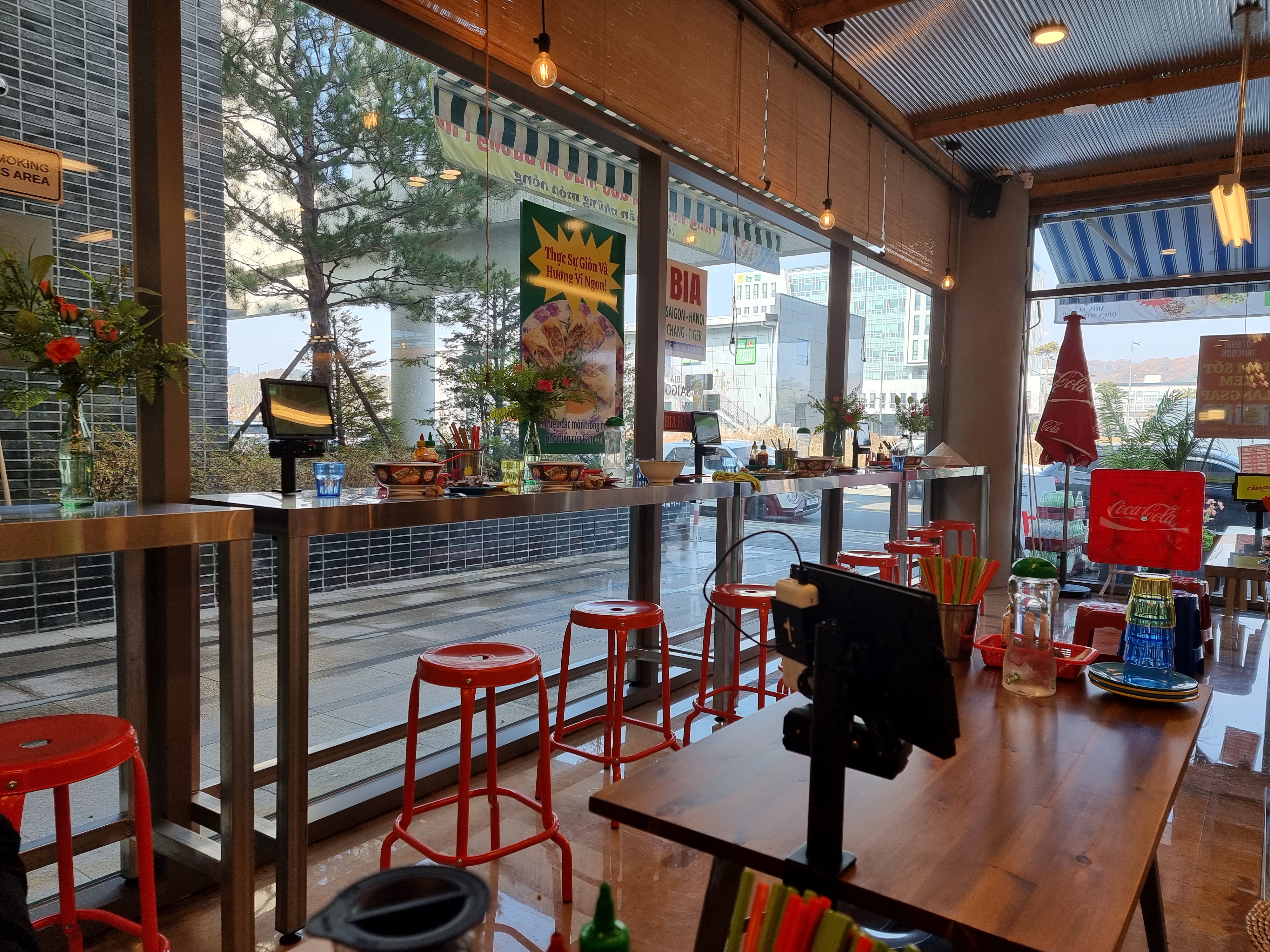 이곳은 주문을 각 테이블마다 설치된 모니터를 이용합니다. 한국어로 돼 있고 그림과 설명이 일부 있어서 주문에 어려움은 없었어요. 오히려 이런식으로 주문하니 더 천천히 고민할 수 있고 눈치 안봐도 되고 좋더라고요. 저희는 까몬쌀국수 하나와 까몬볶음밥 하나를 주문했습니다. 점심시간이었던터라 손님들이 굉장히 많았어요.