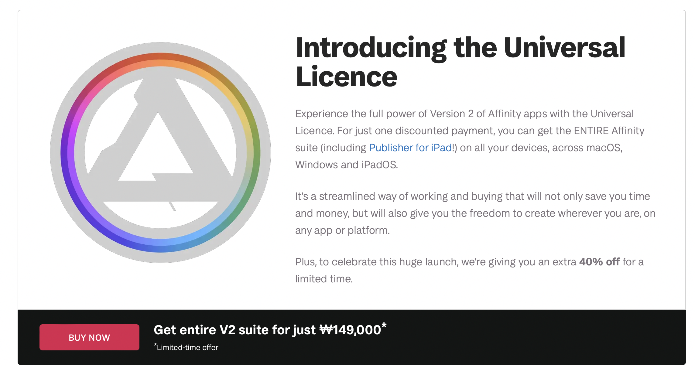 유니버셜 라이선스는 어피니티포토 3개 라이선스(맥, 윈도우, 아이패드)를 포함하고 있고, 여기에 어피니티 디자이너와 퍼블리셔까지 포함되어 있는데 149,000원이라서 제 생각에는 아이패드와 mac, 또는 mac과 윈도우와 아이패드 등 여러 기기를 사용하시는분들에겐 유니버셜 라이선스 제품군이 가성비가 좋아보입니다.