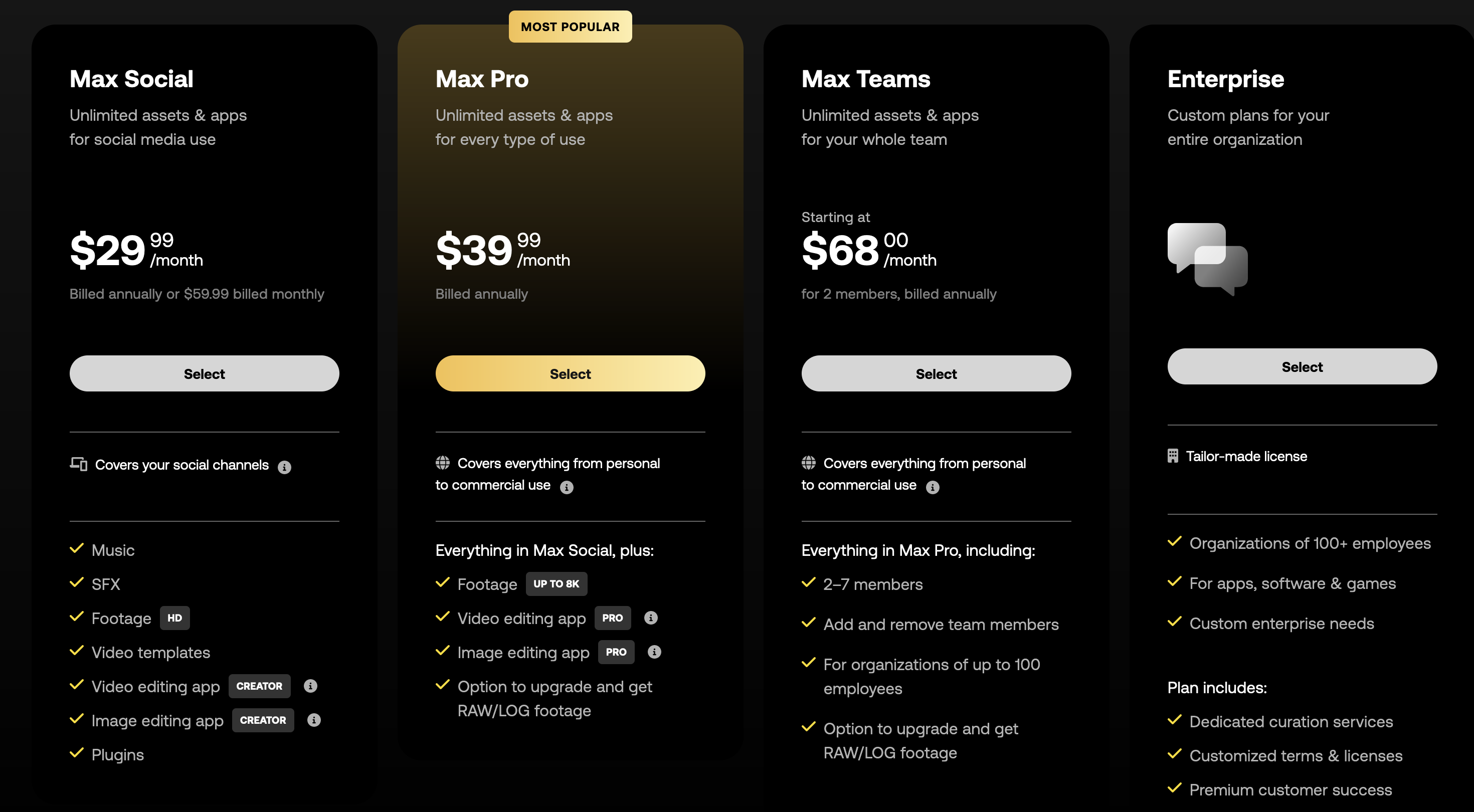 가격 가성비의 경우, 번들로 묶여있는 아트리스트 맥스 플랜이 좋은 편이라서 영상 제작에서 음악과 효과음, 템플릿과 플러그인, 영상 푸티지 등 다양한 디지털 자산이 필요하신 경우에는 따로 결제하기보다는 아트리스트 맥스를 통해 결제하는게 유리합니다.