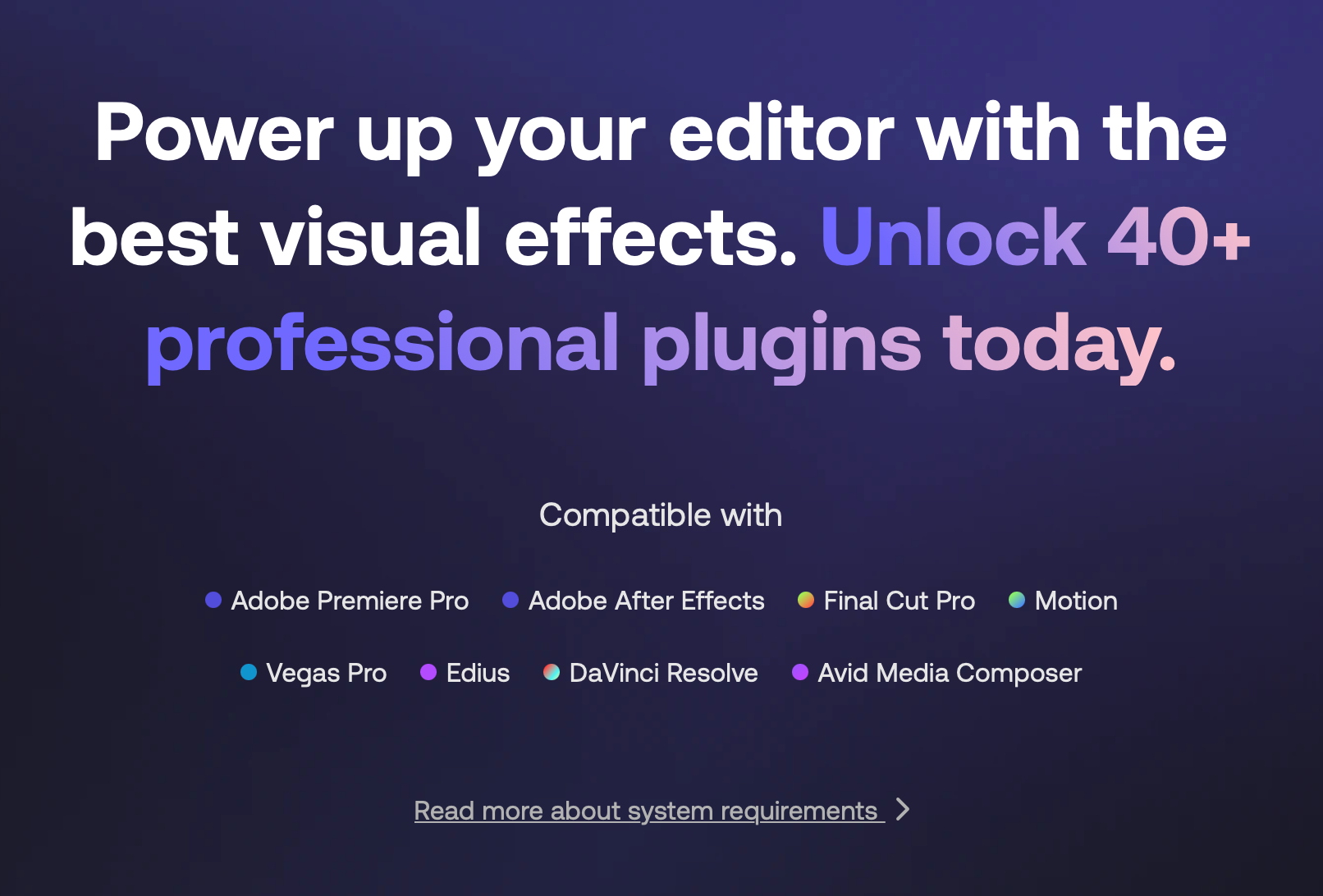 플러그인의 경우 현재 기준으로 약 40개 정도의 플러그인을 무료로 이용할 수 있도록 해주고 있습니다. 이 플러그인들은 프리미어, 애프터이펙트, 파이널컷, 모션, 베가스, 다빈치리졸브 등 인기 영상 편집 소프트웨어에서 모두 사용할 수 있는 상품들입니다.