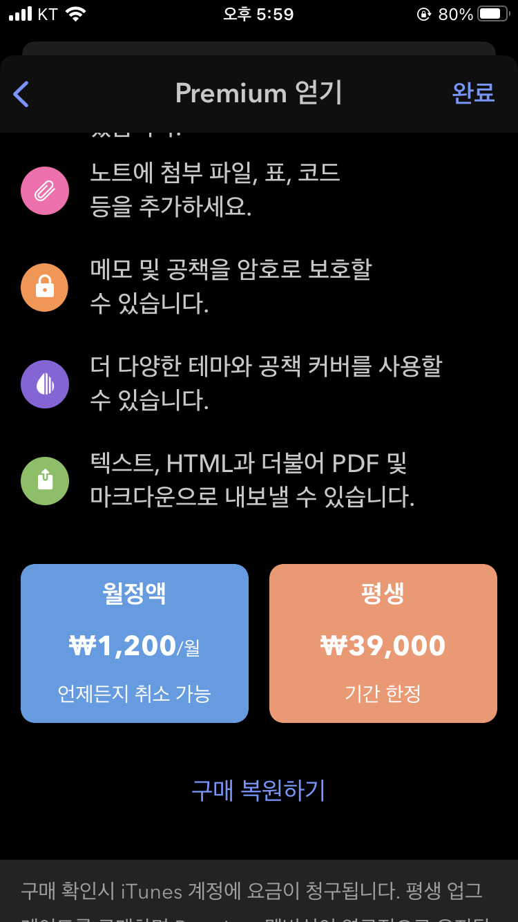 이건 아이폰 결제화면입니다. 아이폰에서도 맥북과 동일하게 월정액은 1200원이며 평생 라이선스 1회성 구매는 39,000원에 판매하고 있습니다.