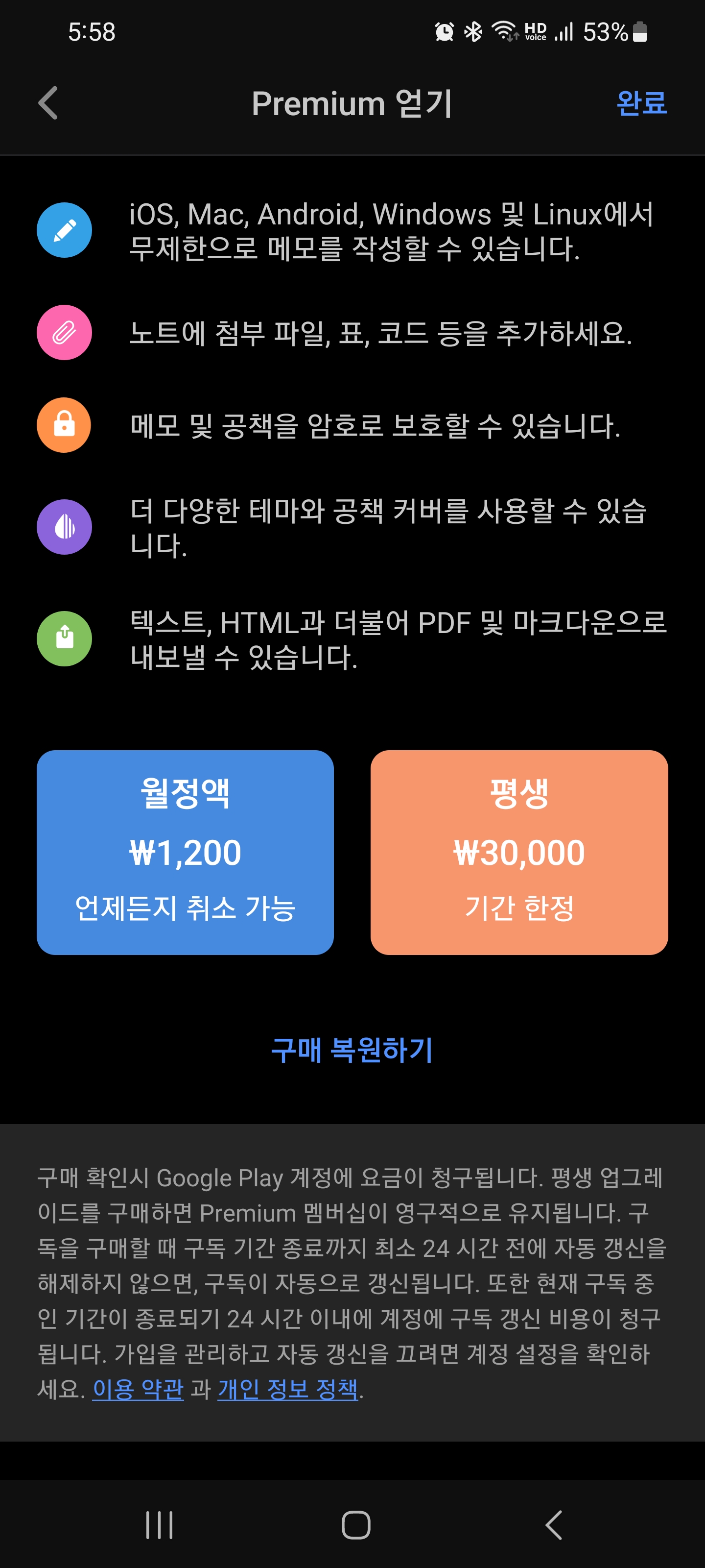 그런데 안드로이드의 경우에는 가격이 다릅니다. 지금 이 캡처는 갤럭시 폰 기준인데요. 월정액 가격은 동일하나 평생 라이선스는 안드로이드에서는 30000원에 결제가 가능합니다. 9천원이 차이나는 가격이에요. 왜 이런지는 모르겠으나 어차피 업노트 자체가 유니버셜 앱이기도 하고 하나의 계정으로 여러개의 운영체제를 동기화해서 쓰는 것이 장점이기 때문에