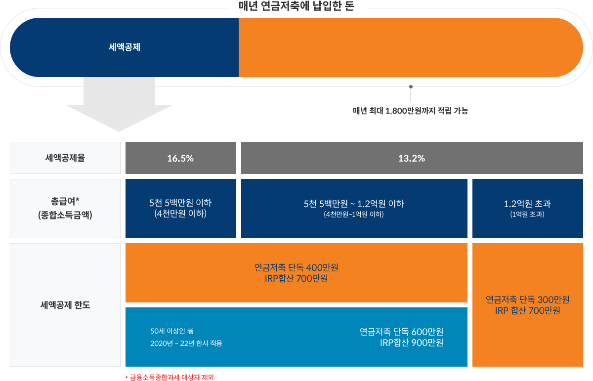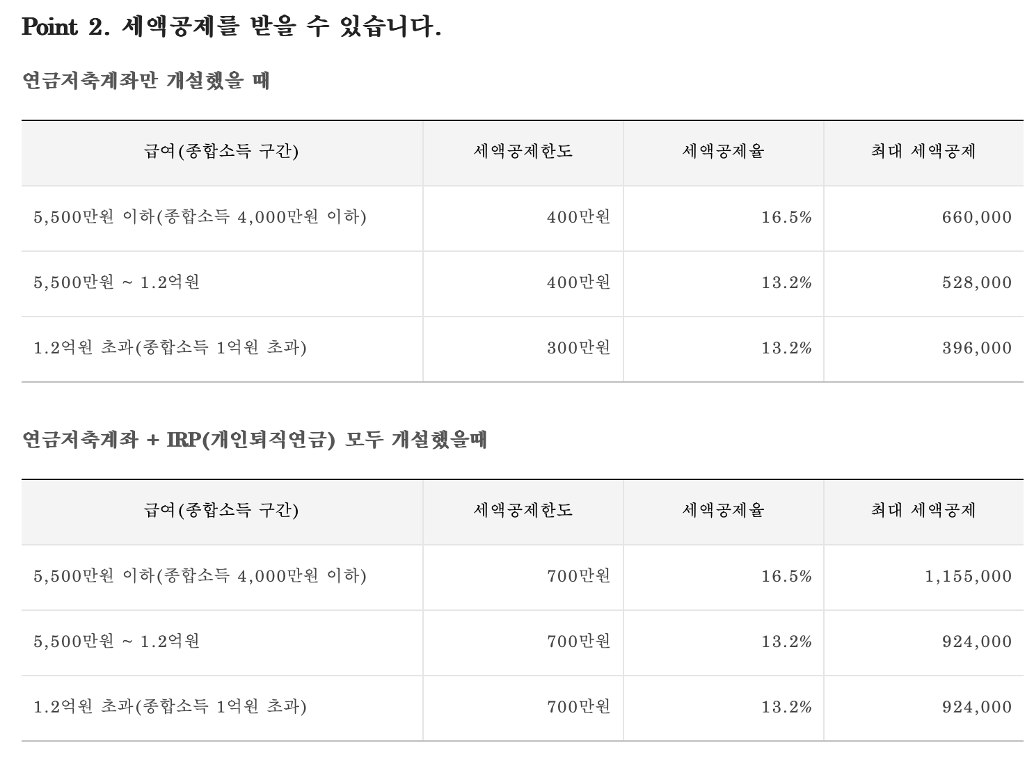 종합소득금액 또는 총급여 기준으로 5천 5백만원이하(종합소득은 4천만원 이하)의 경우와 종합소득금액 1억 이하 구간에서는 연금저축 단독으로는 연간 400만원의 한도내에서 16.5% 세액공제를 해줍니다. 이게 개인연금저축 계좌를 운영할때의 최대 장점 같습니다. IRP계좌는 저는 아직 개설하지 않았는데 나중에 개설할 생각도 있는데, IRP 계좌까지 합하면 700만원 한도로 세액공제가 됩니다.