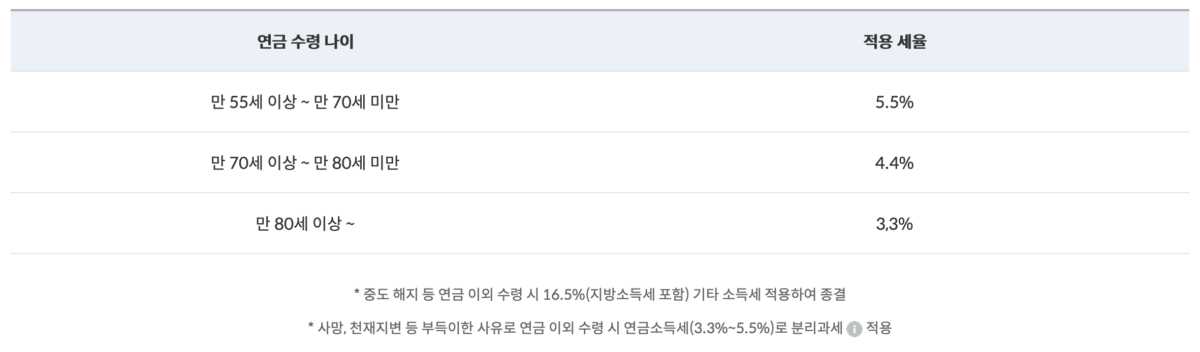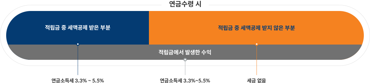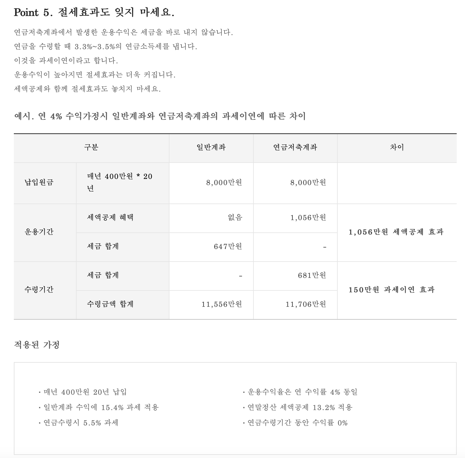 - 과세이연 : 연금저축계좌에서의 적립금은 당장 세금을 과세하지 않고 나중에 연금으로 받을 때 과세합니다. 이렇게하면 당장의 투자금이 줄어들지 않고 나중에 미뤄서 세금을 내는 방식이라서 장기투자를 할 때에는 과세이연 효과가 나타나게 됩니다. (연금 수령 시 연금소득세 부과(연간 수령액 1,200만원 한도로 분리과세)