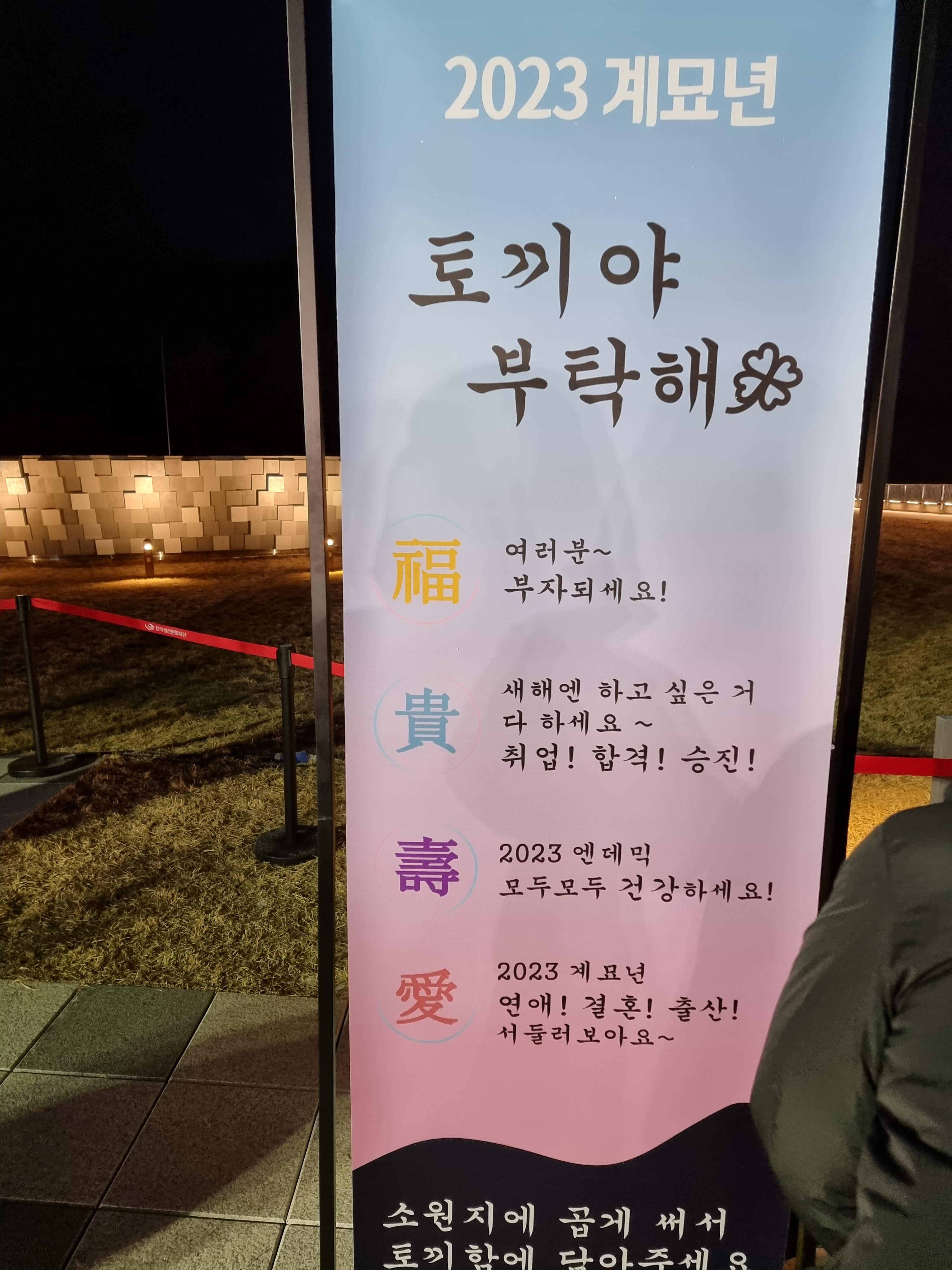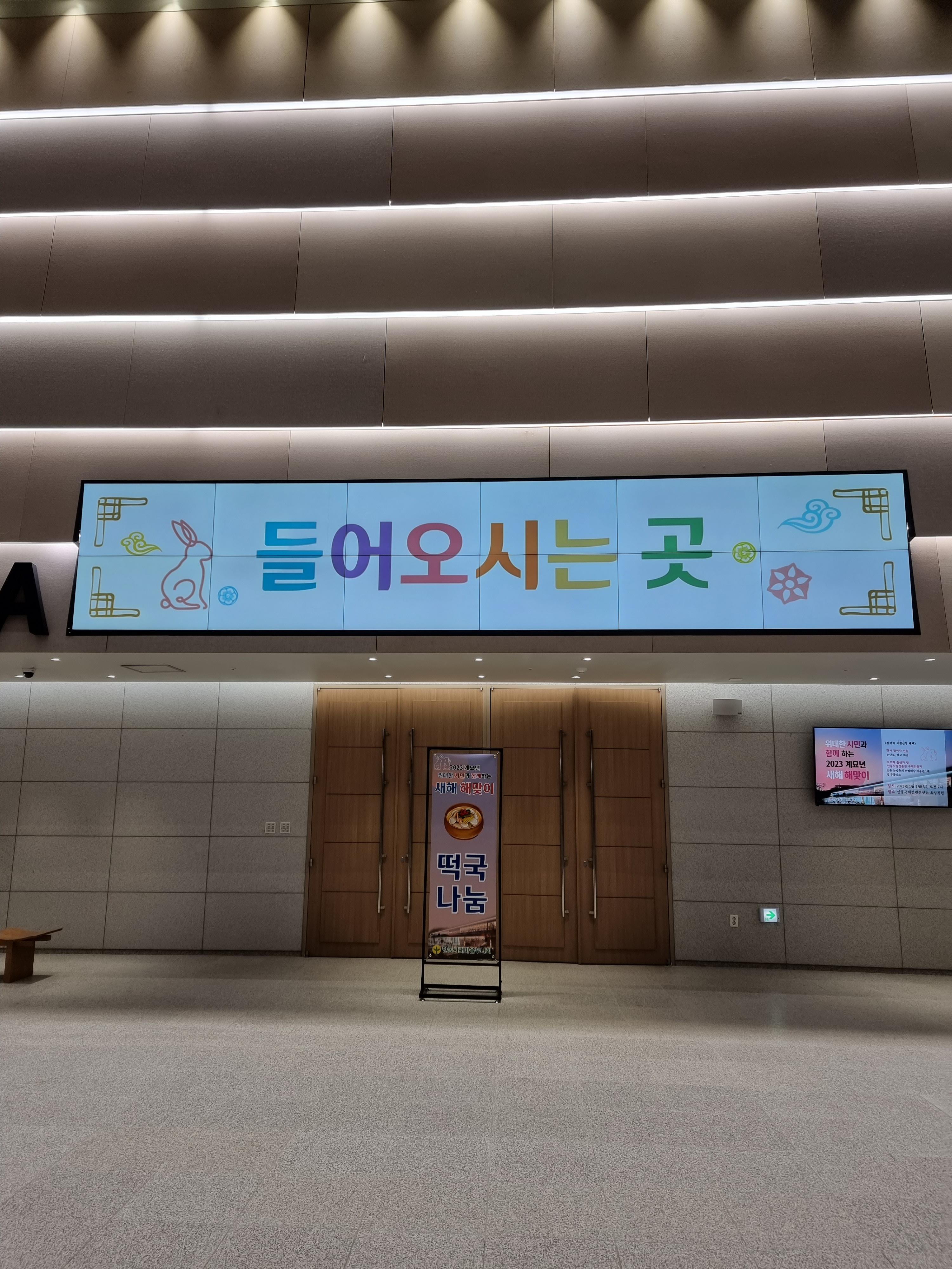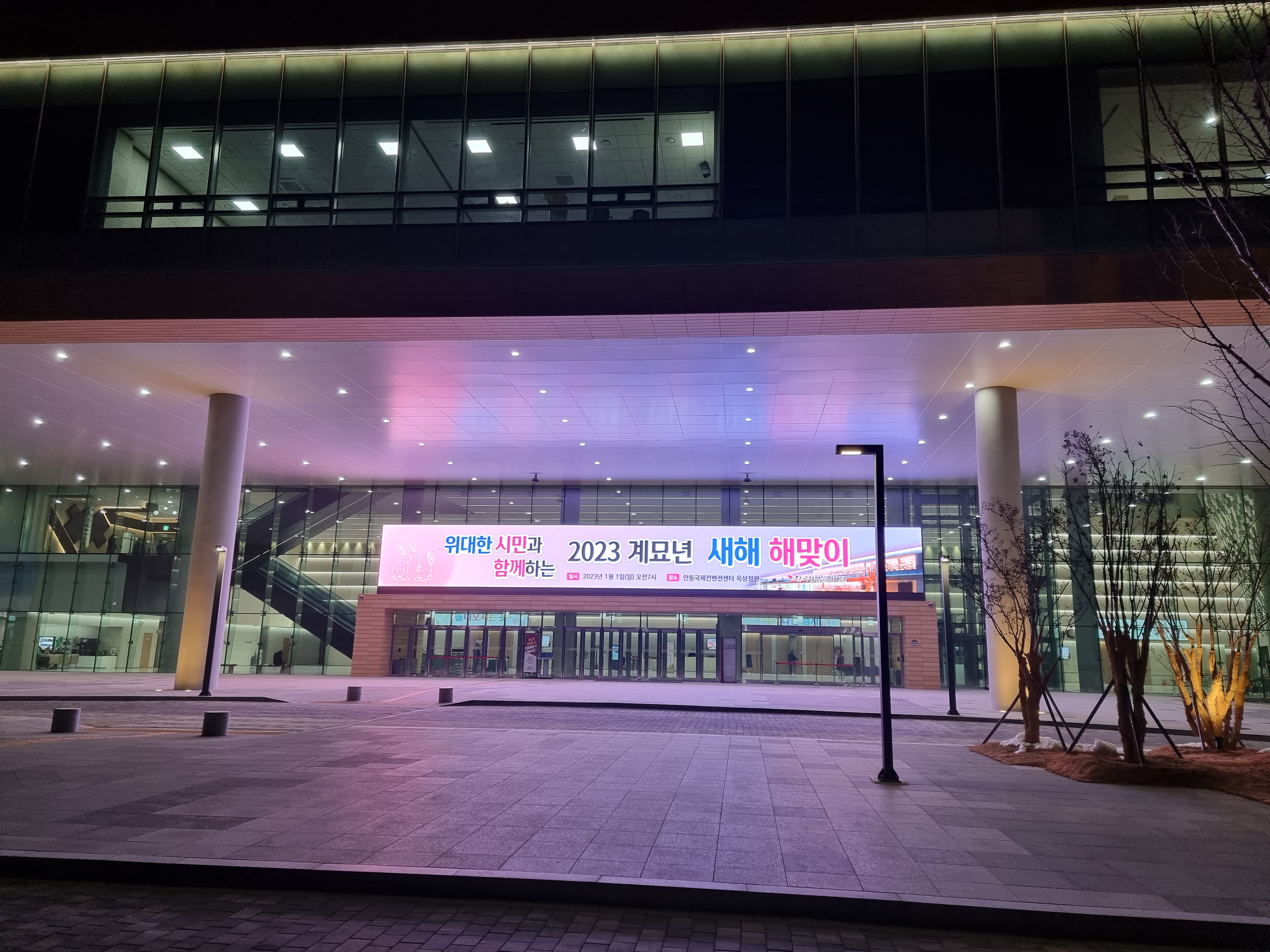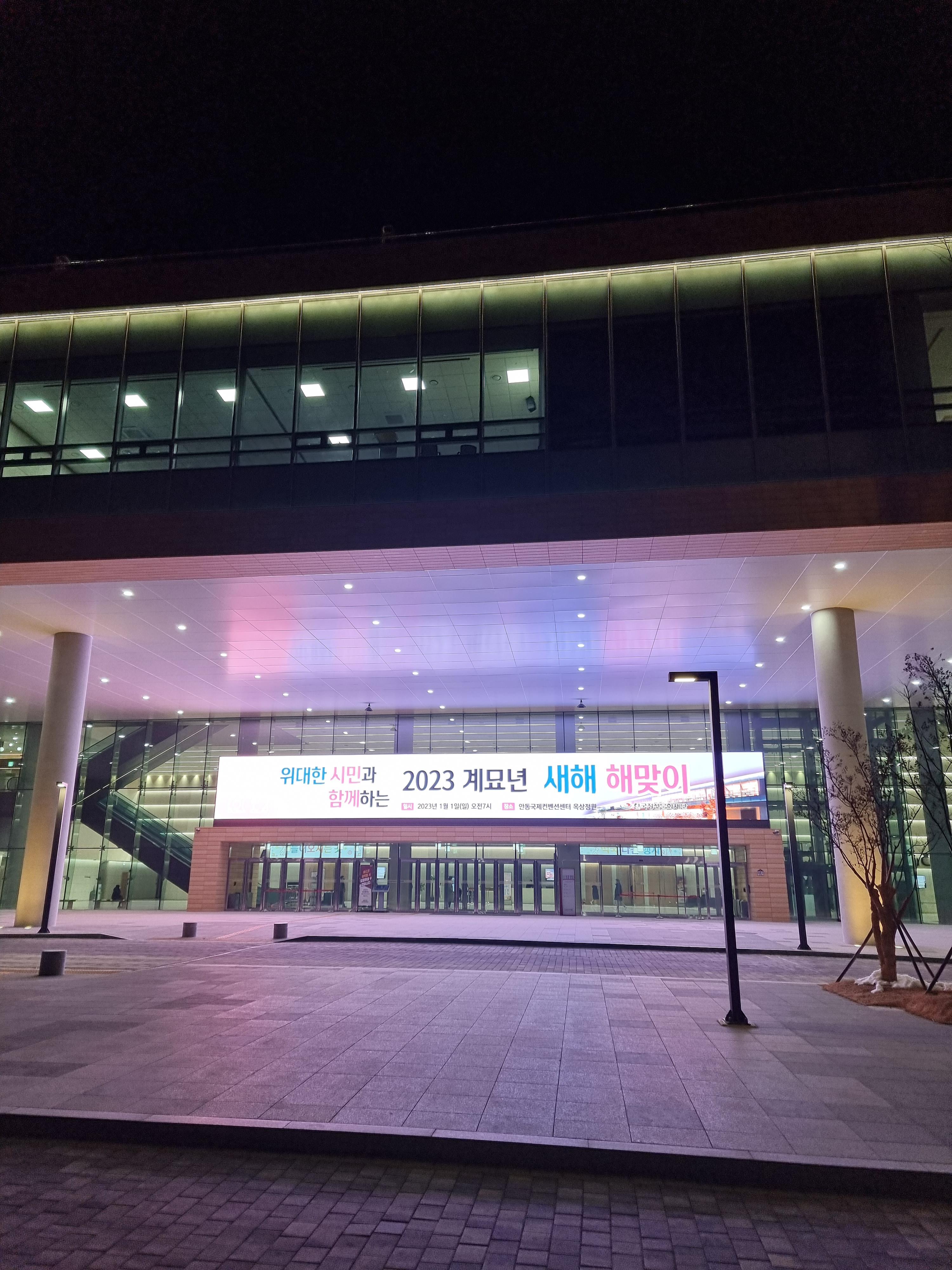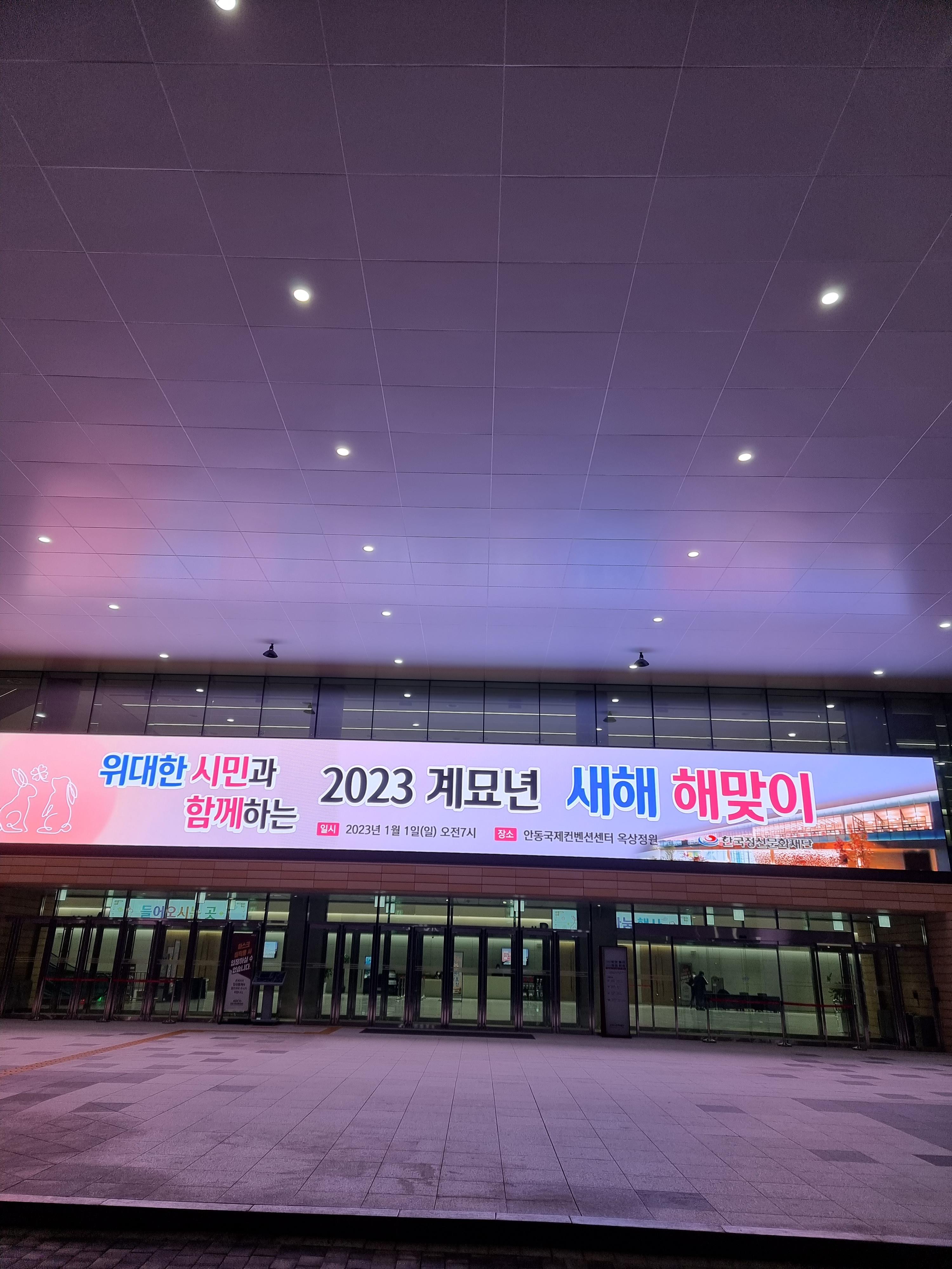 안동국제컨벤션센터는 지난번 여름께 한 번 방문했던적이 있었는데 이렇게 새벽이나 밤에 방문하는건 처음이었습니다. 아무래도 약간 외진 곳에 있다보니 날씨를 알 수 없어서 두툼하게 껴입고 갔었는데 잘한 선택이었던 것 같습니다. 입구에서는 큰 전광판으로 2023년 계묘년 새해 해맞이 행사를 알리는 문구가 있었습니다.
