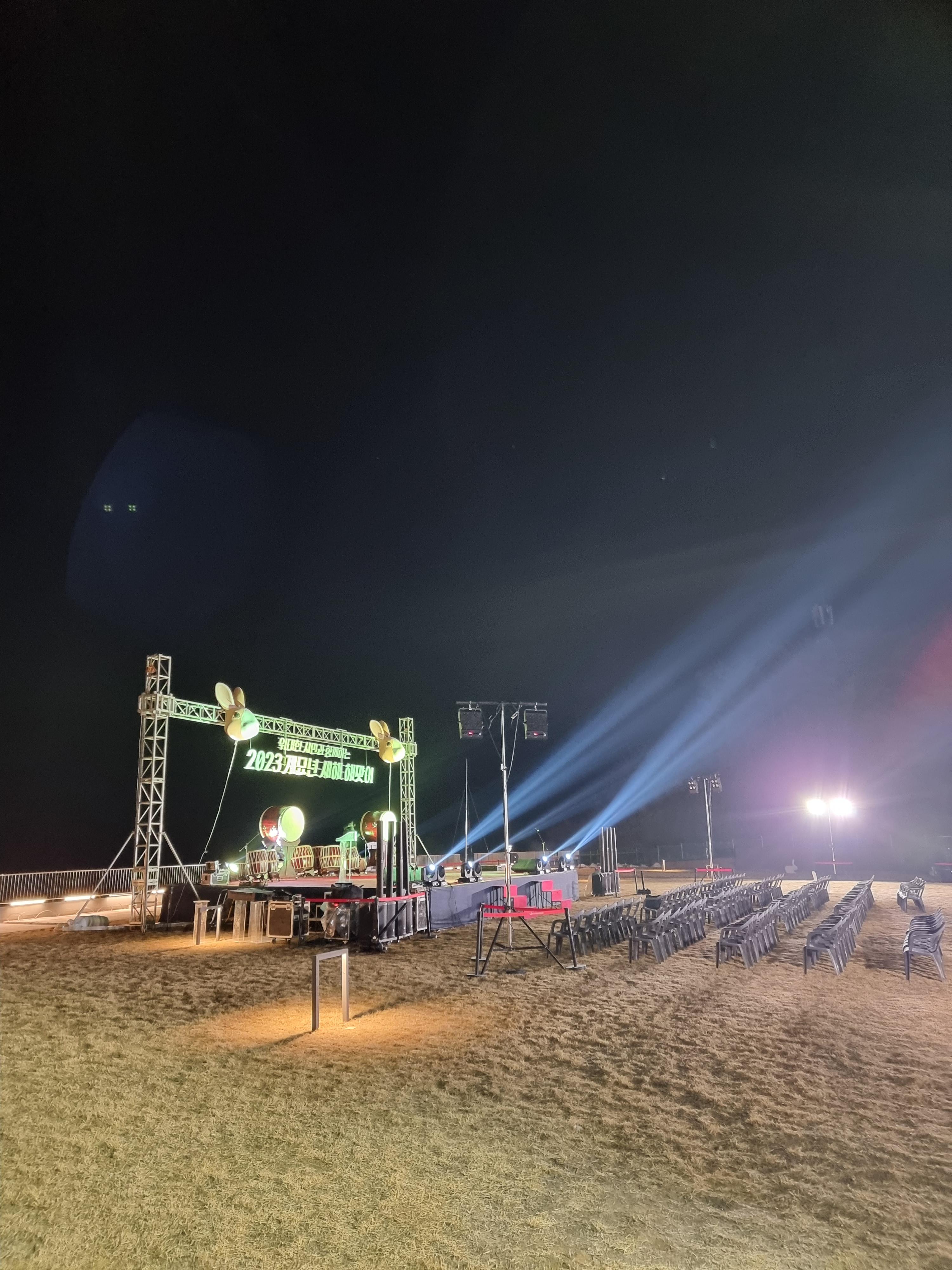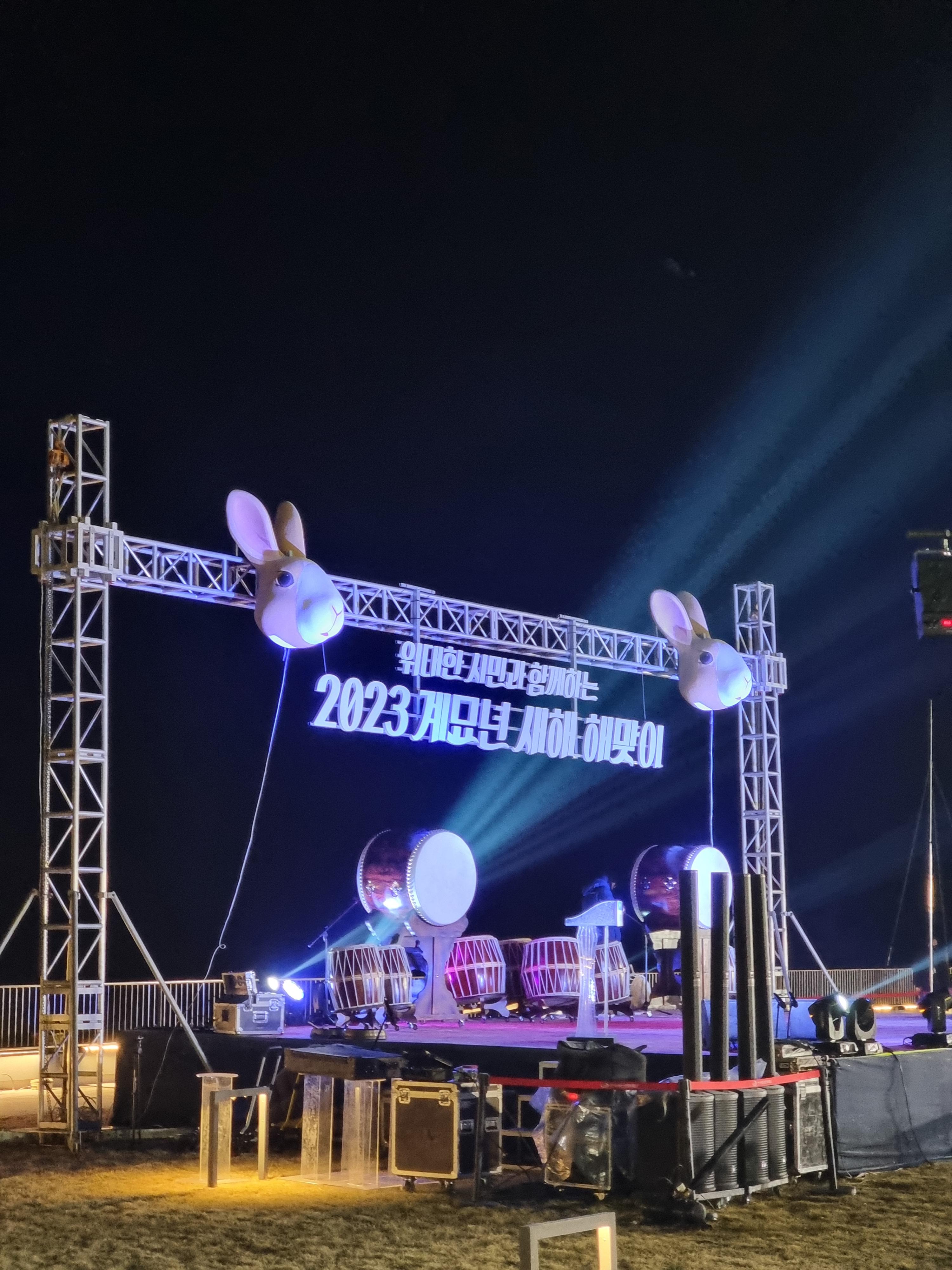안동국제컨벤션센터 3층에 있는 옥상정원에서 진행될 2023 계묘년 새해 해맞이 행사장 모습입니다. 이때가 약 6시 조금 넘은 시간이었는데 리허설 관계로 조금 있다가 오라고하셔서 다시 내려갔다가 조금 뒤에 다시 올라갔습니다. ㅎㅎ