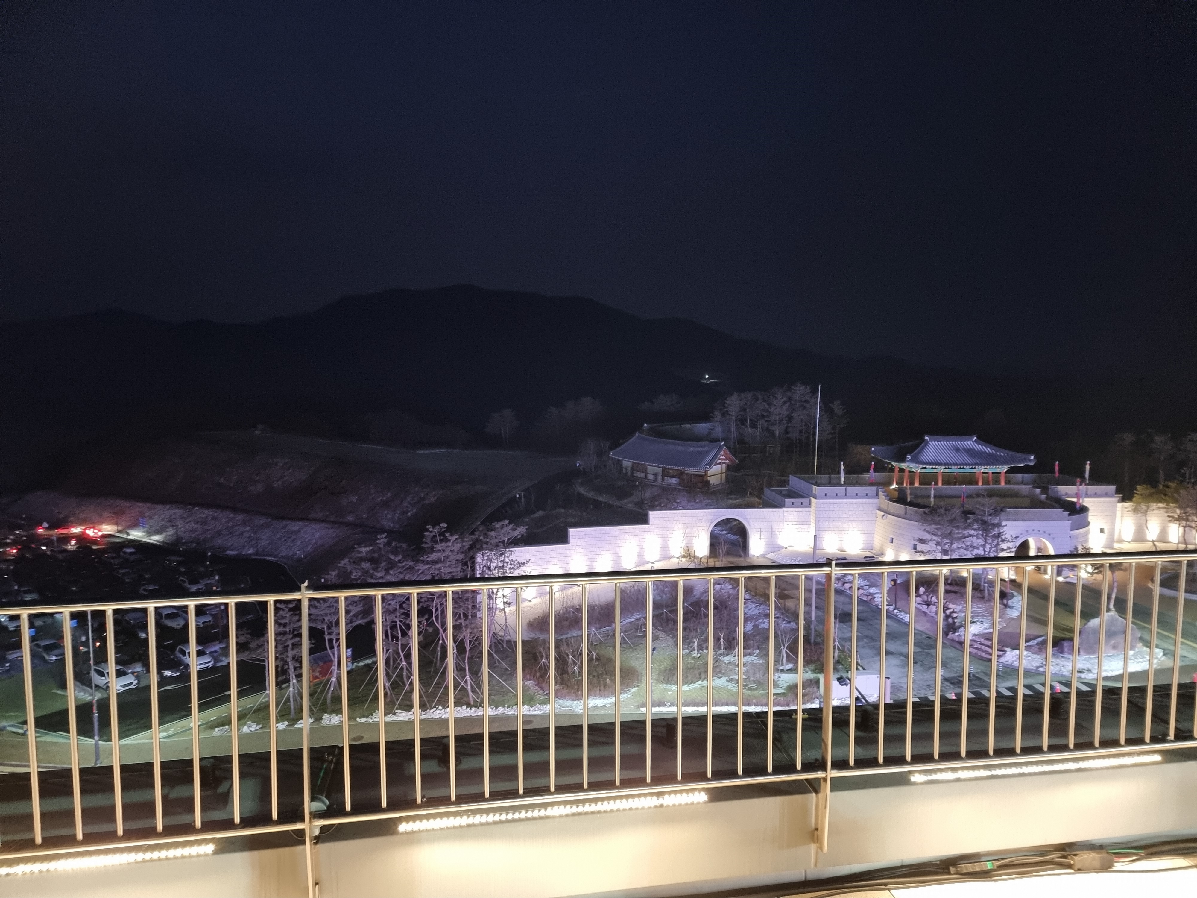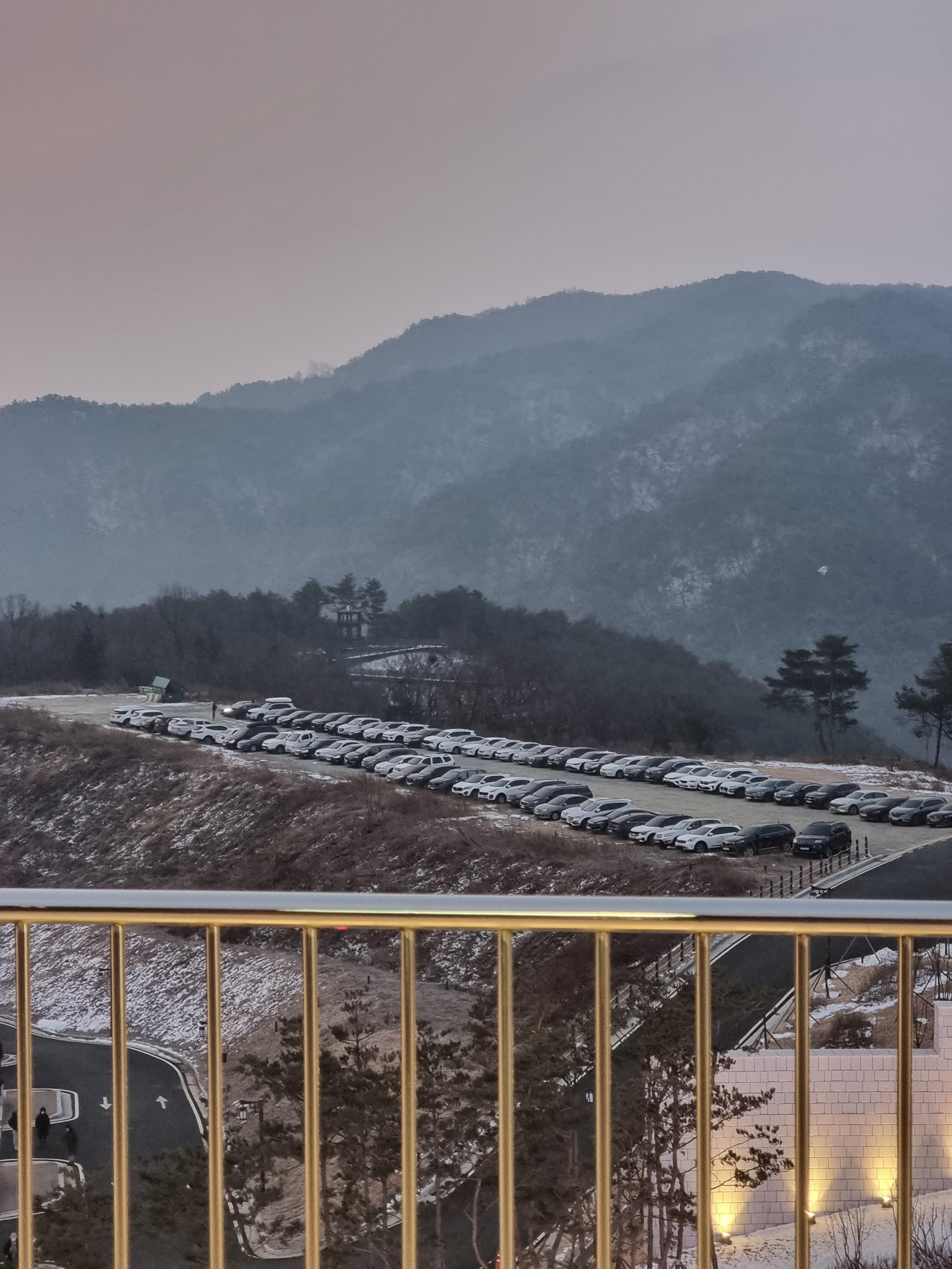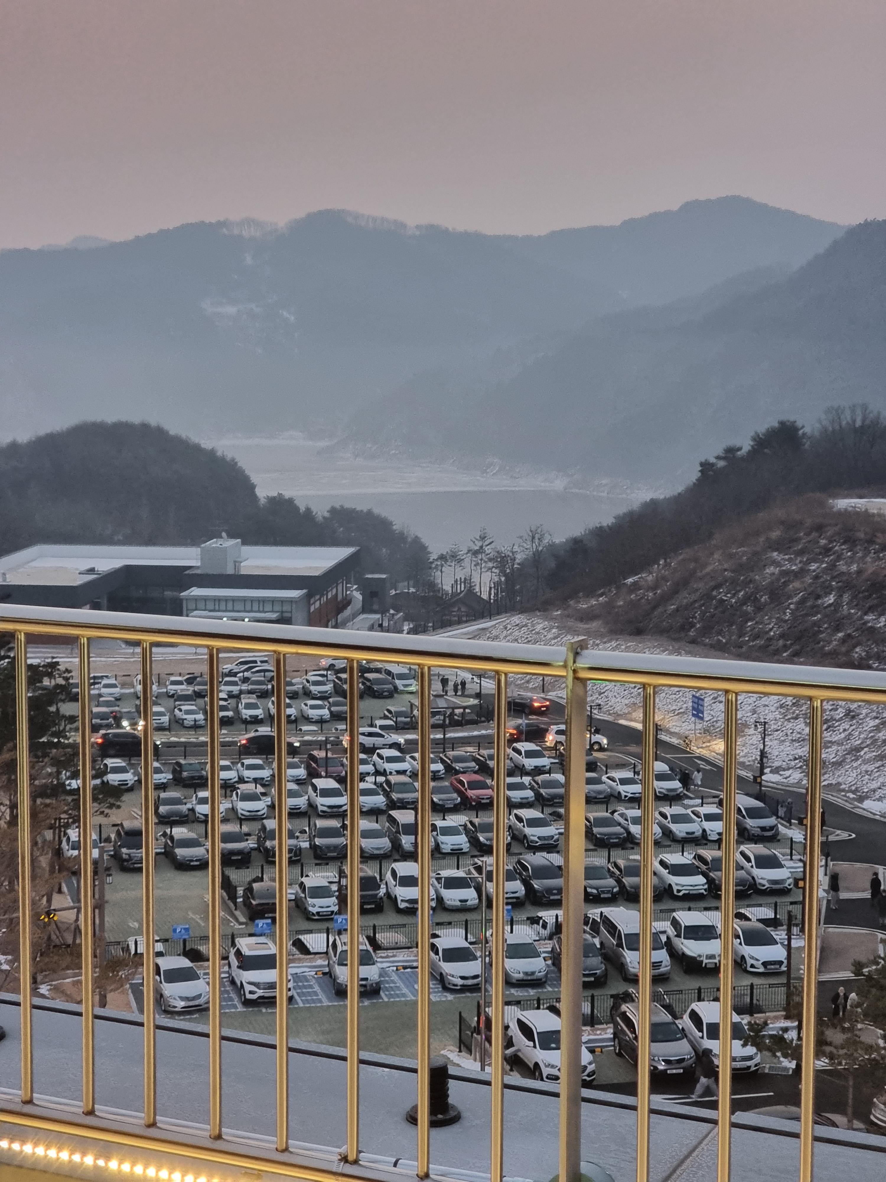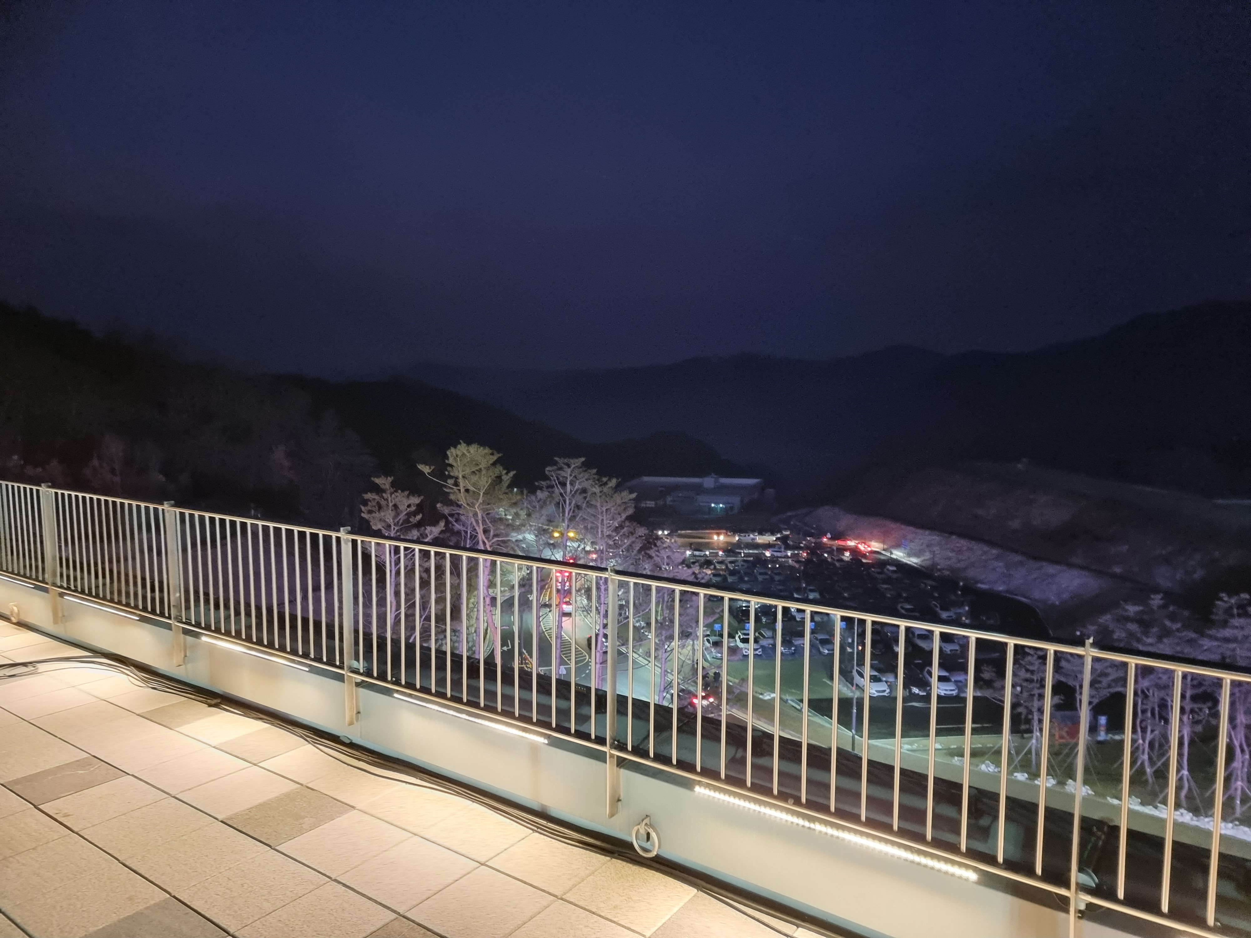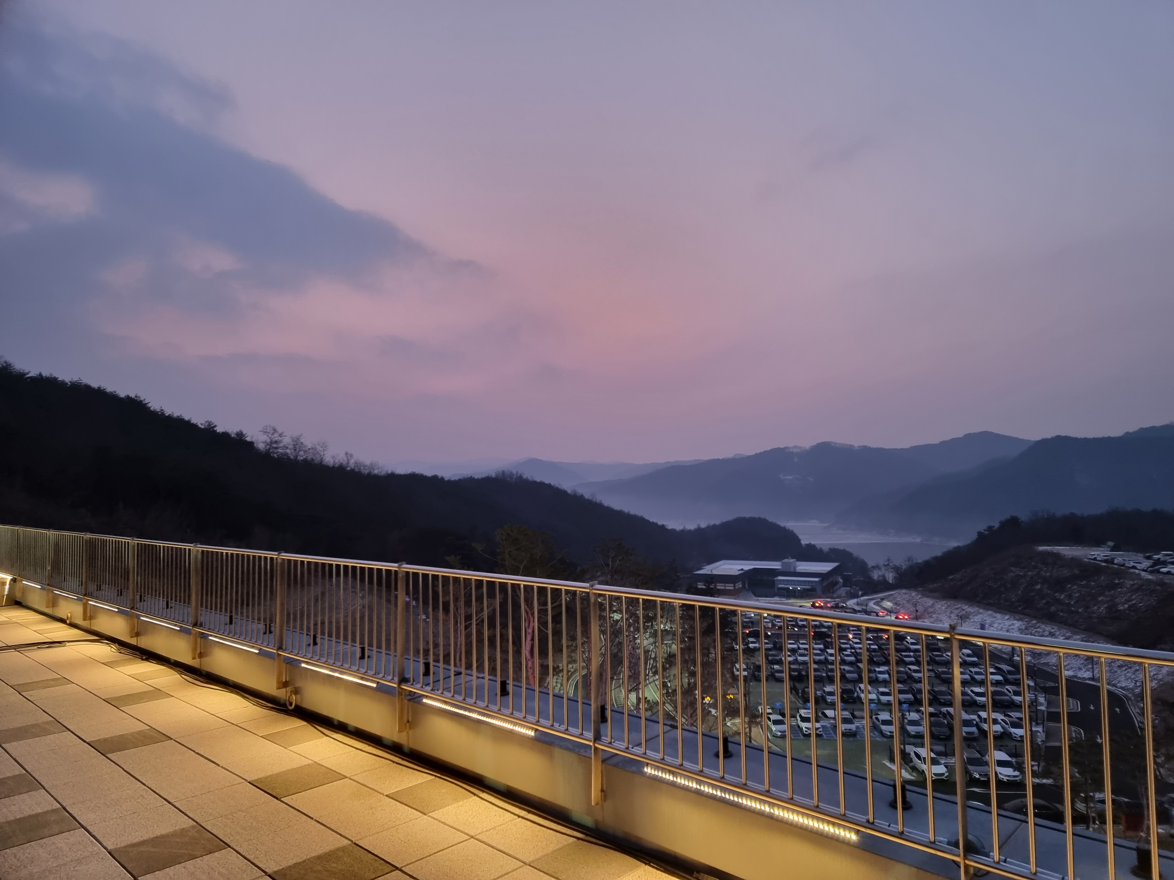 잠시 시간이 남아서 해가 뜨는 동쪽을 바라보게 되었는데요. 주차장이 이미 만차로 향해가고 있었고 아직 동은 트기 전이었습니다. 동트기전의 옥상정원에서의 뷰가 참 멋졌어요.