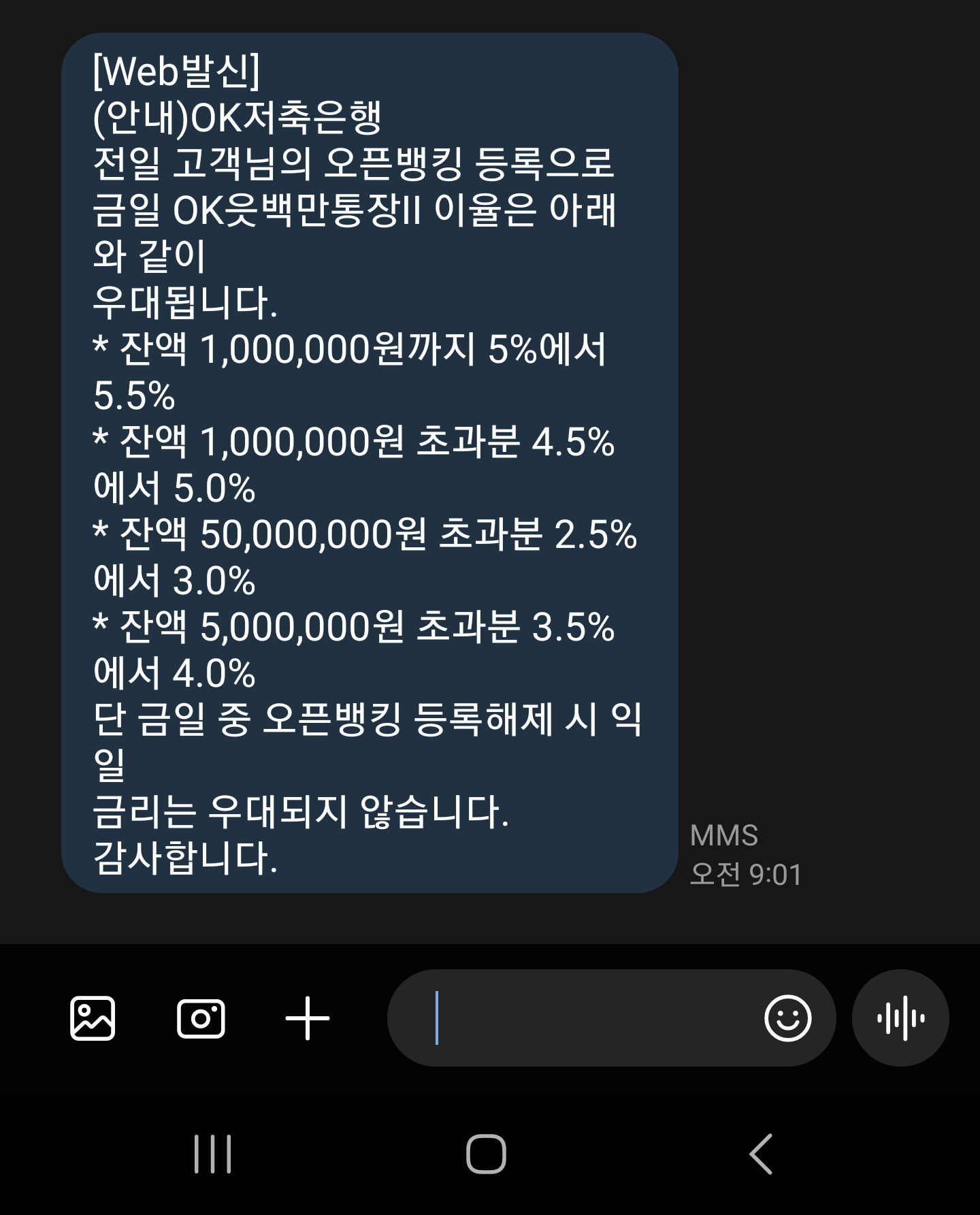 OK저축은행 오픈뱅킹 등록하신분들은 오픈뱅킹 등록 후 금리가 제대로 반영이 되었는지 확인하고 싶으실텐데, 다음날이 되면 아래와 같이 문자메시지로 금리가 변경됨을 알려주기 때문에 하루를 더 기다리시면 됩니다.