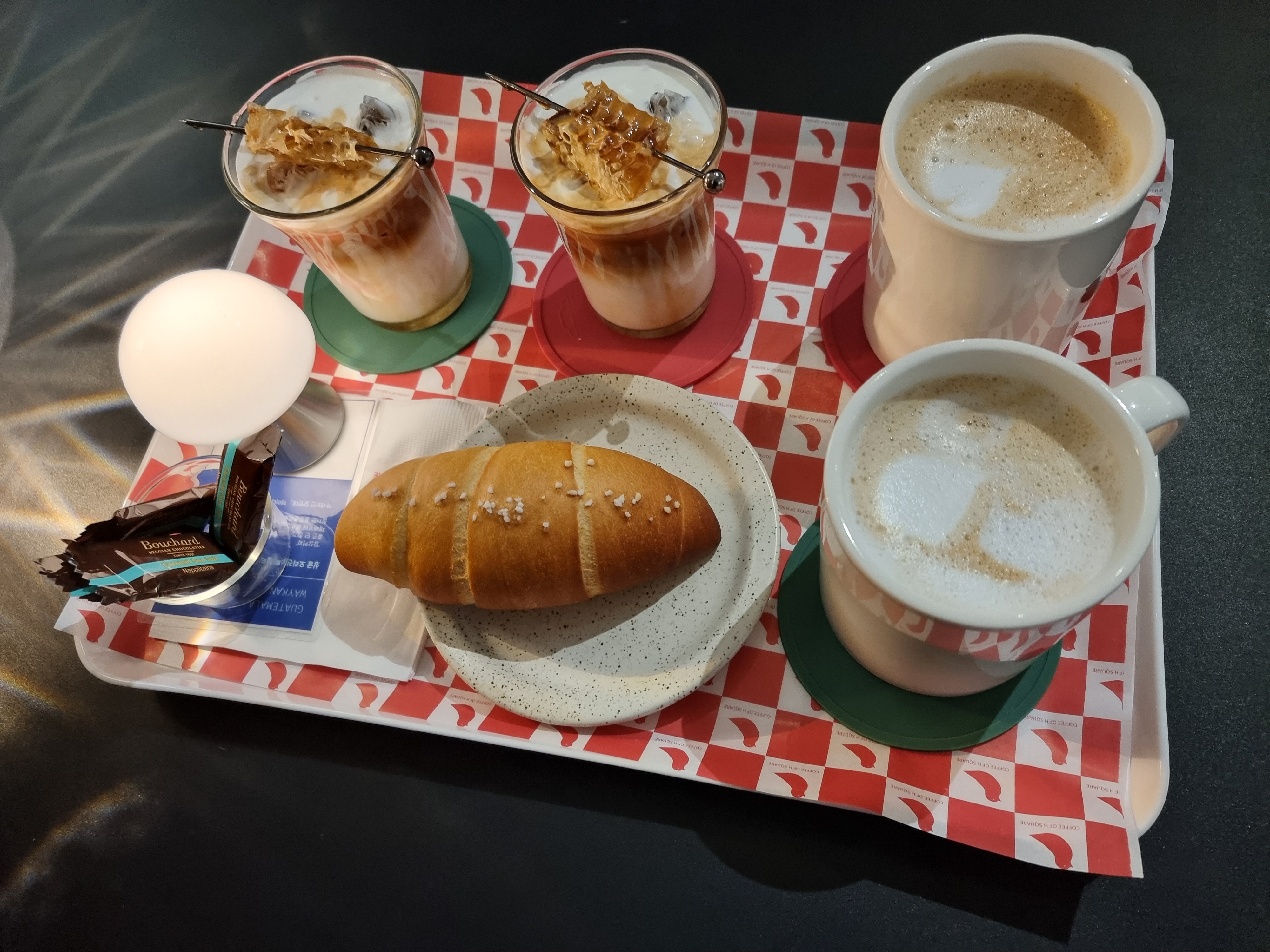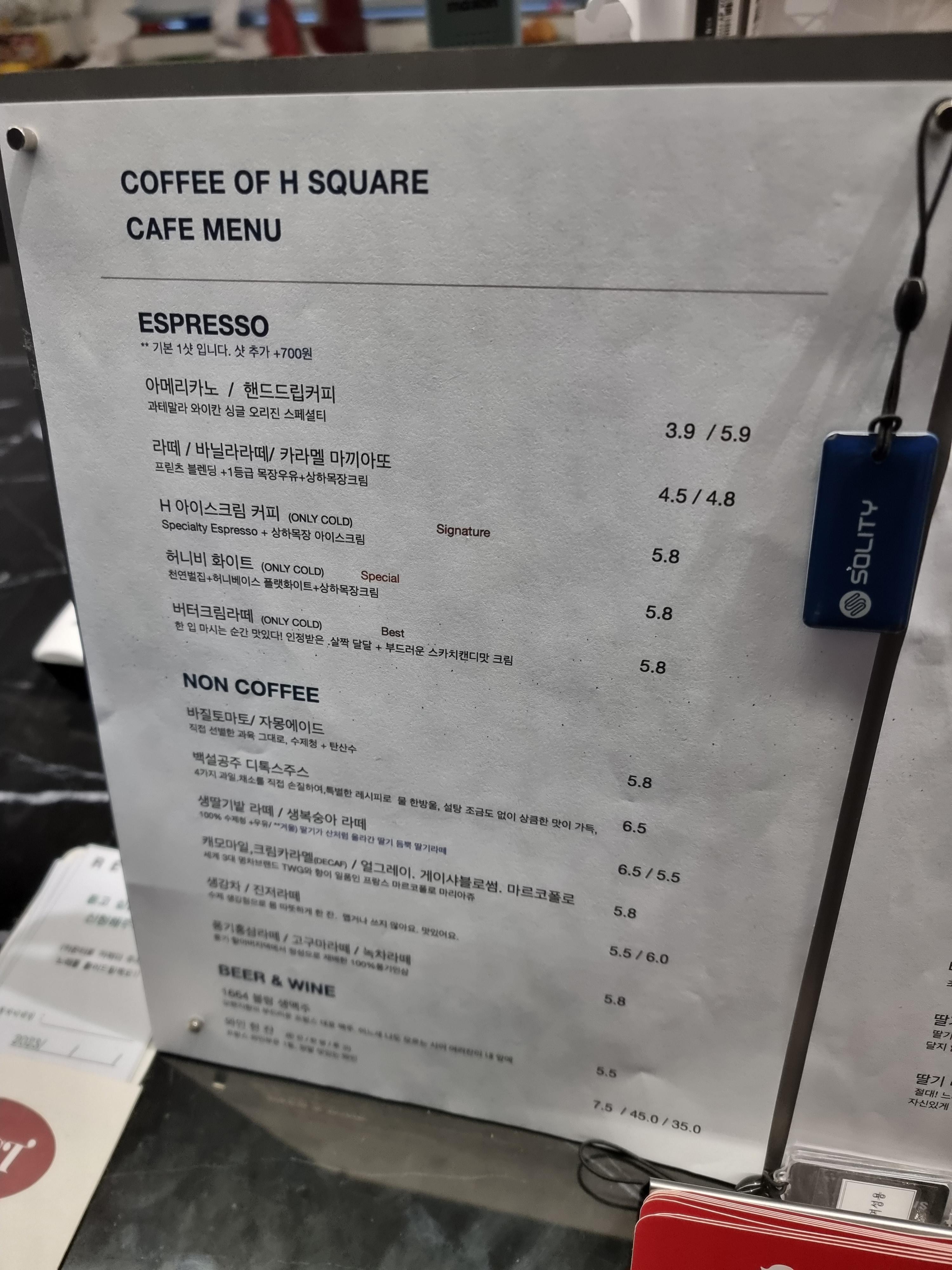 메뉴판 입니다. 저희는 바닐라라떼랑 허니비 화이트 주문했습니다. 소금빵 추가하였어요.