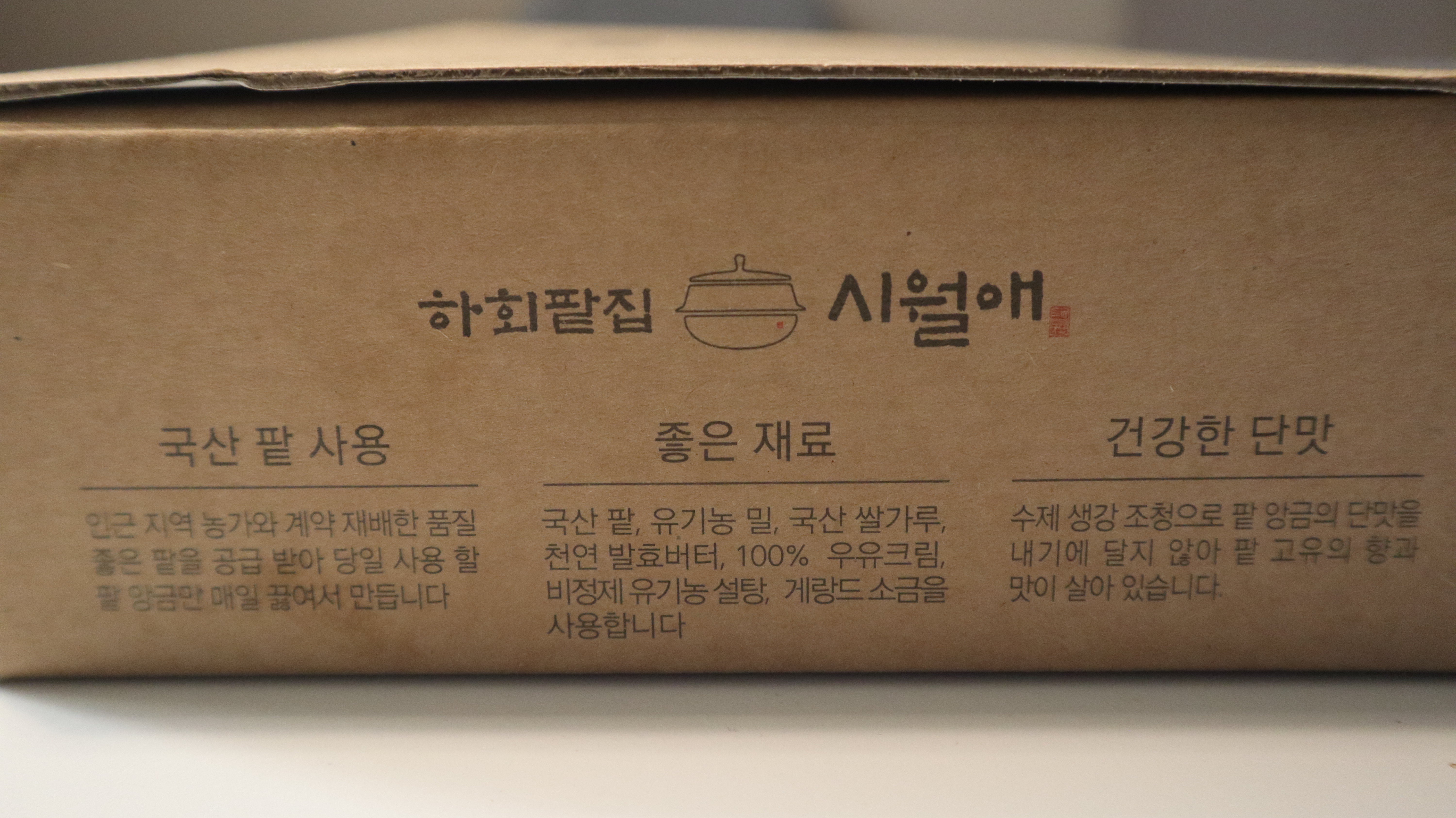 100% 국내산 팥과 안동 생강 조청을 이용해 팥 앙금을 만들었다고 합니다. 팥 특유의 쓴맛을 제거하기 위해서 좋은 팥을 물레 불리고 삶은 다음 다시 찬물에 담그는 과정을 진행했다고 하네요.