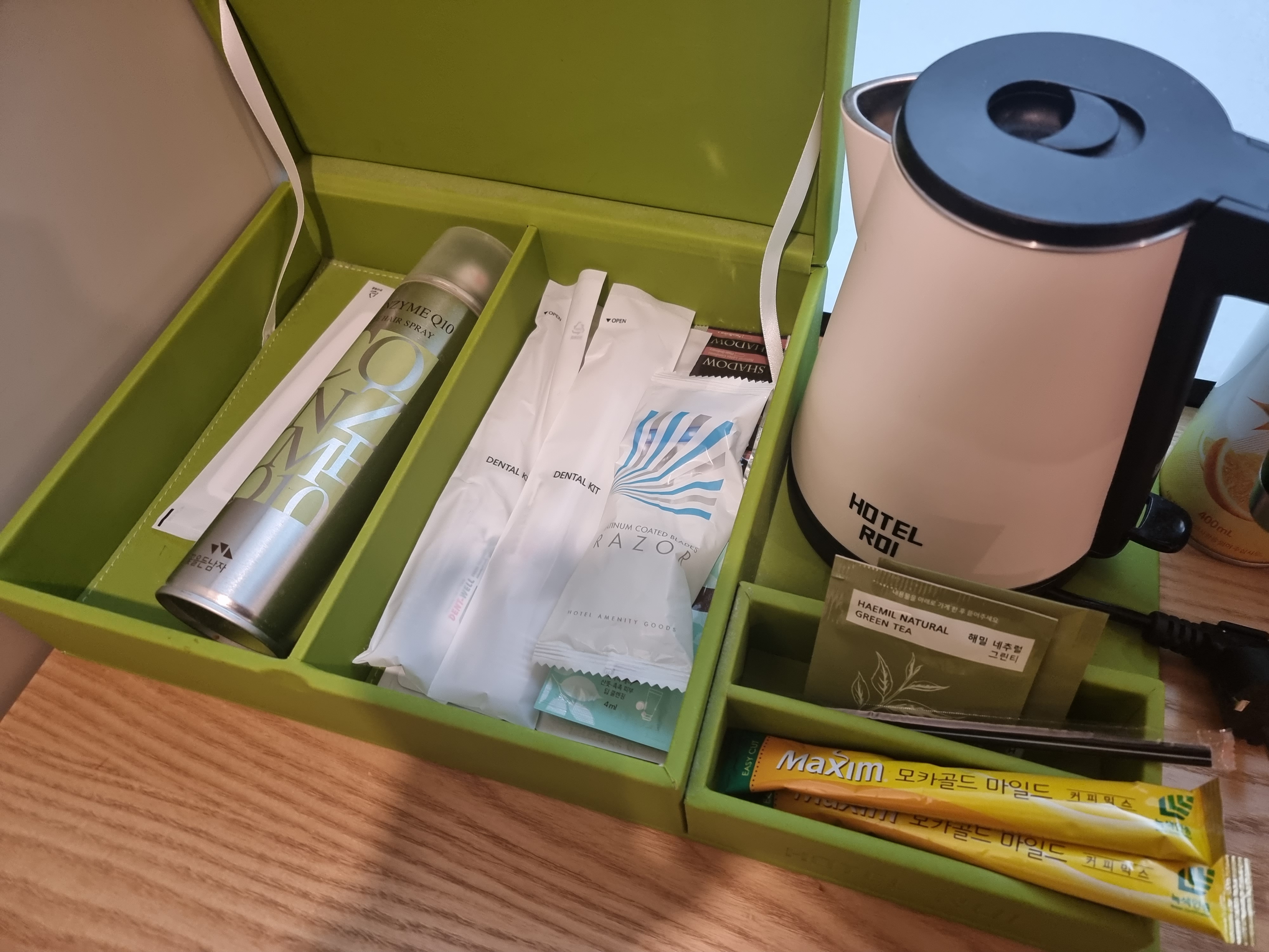 커피포트와 믹스커피, 빗 등 일반적인 숙소에서 볼 수 있는 용품들을 제공하고 있습니다.