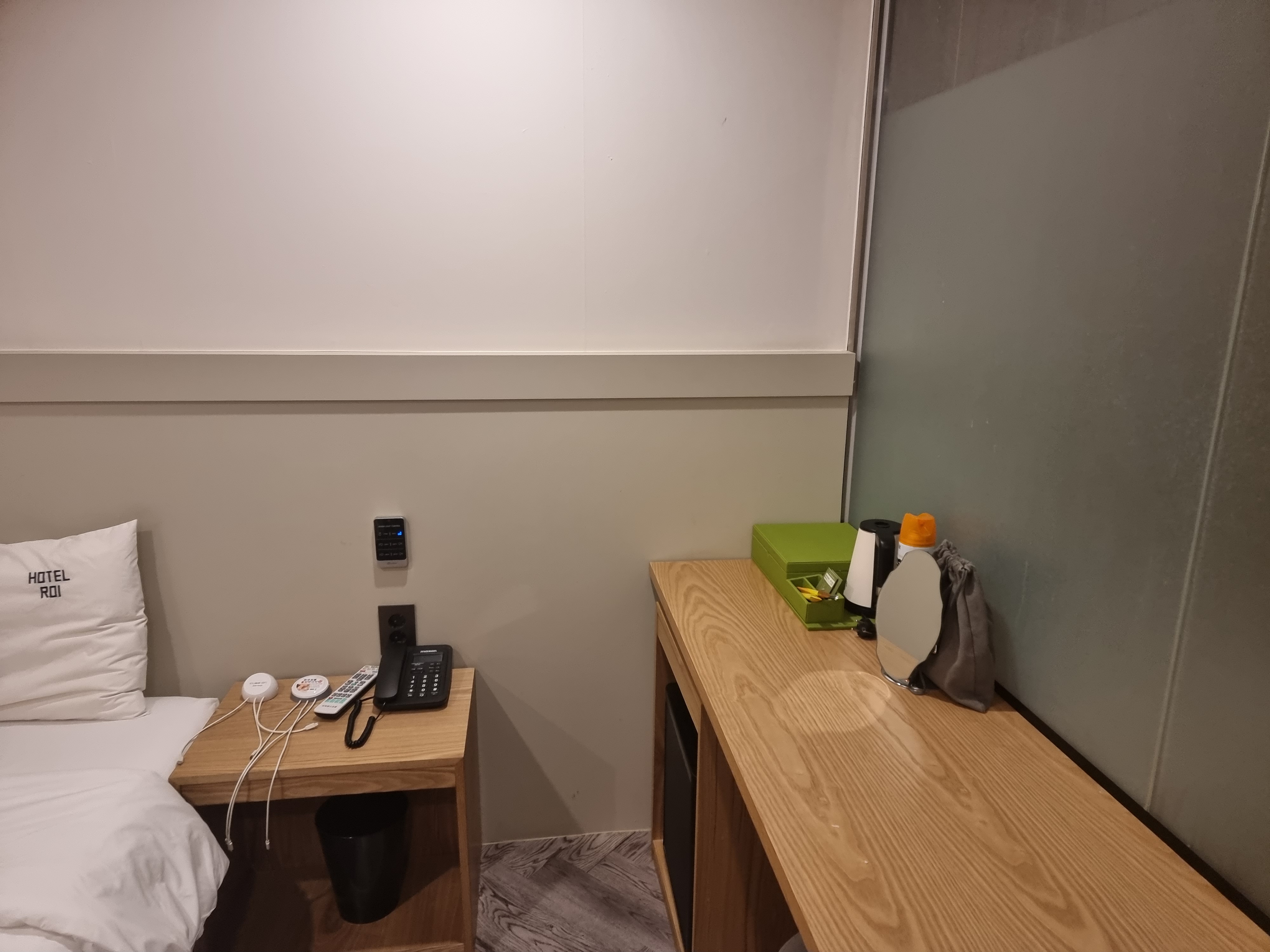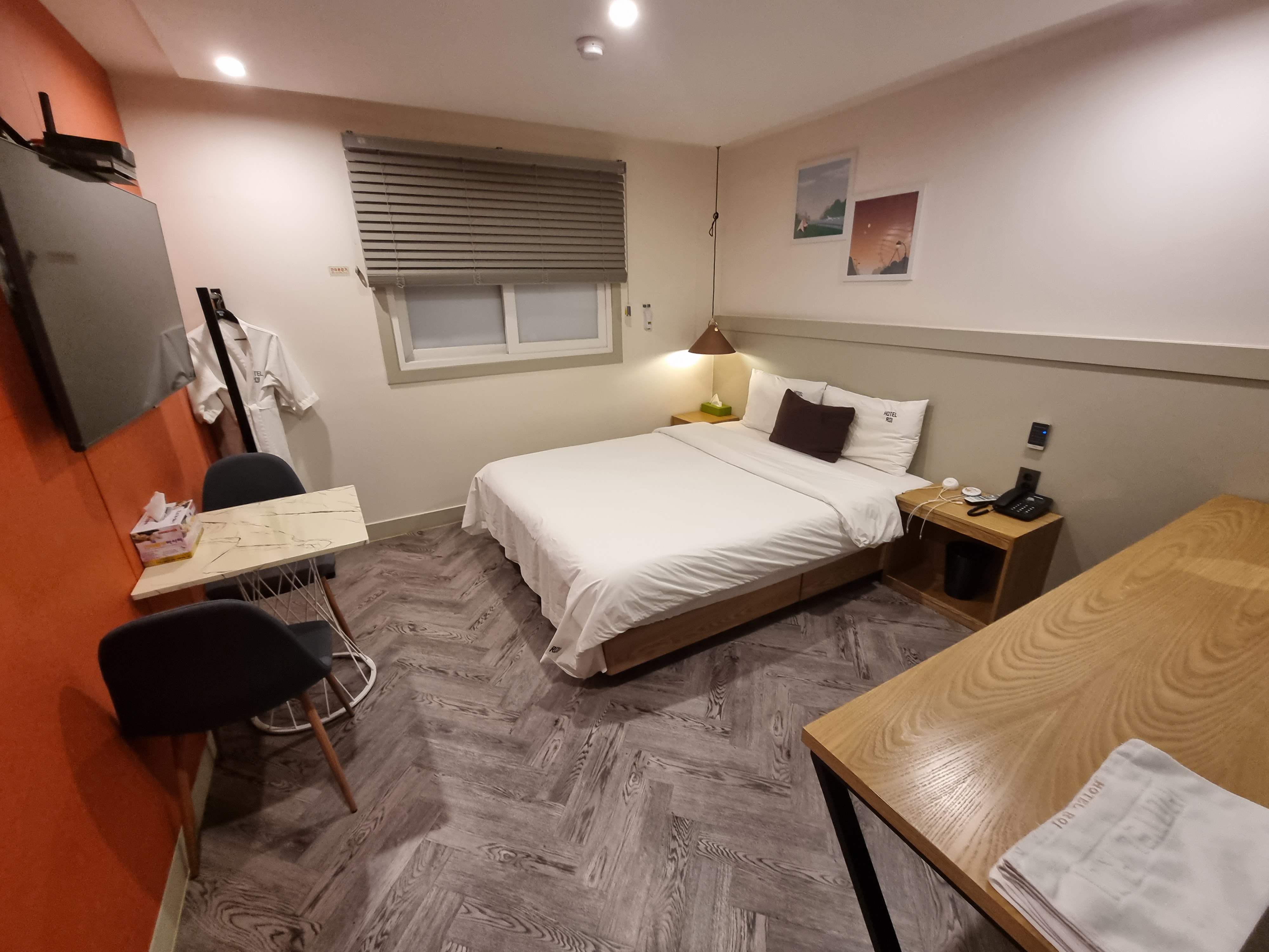 방은 푹신하고 편한 침대 하나와 TV, 그리고 작은 테이블 등이 있습니다. 방이 정말 더울 정도로 따뜻했습니다.