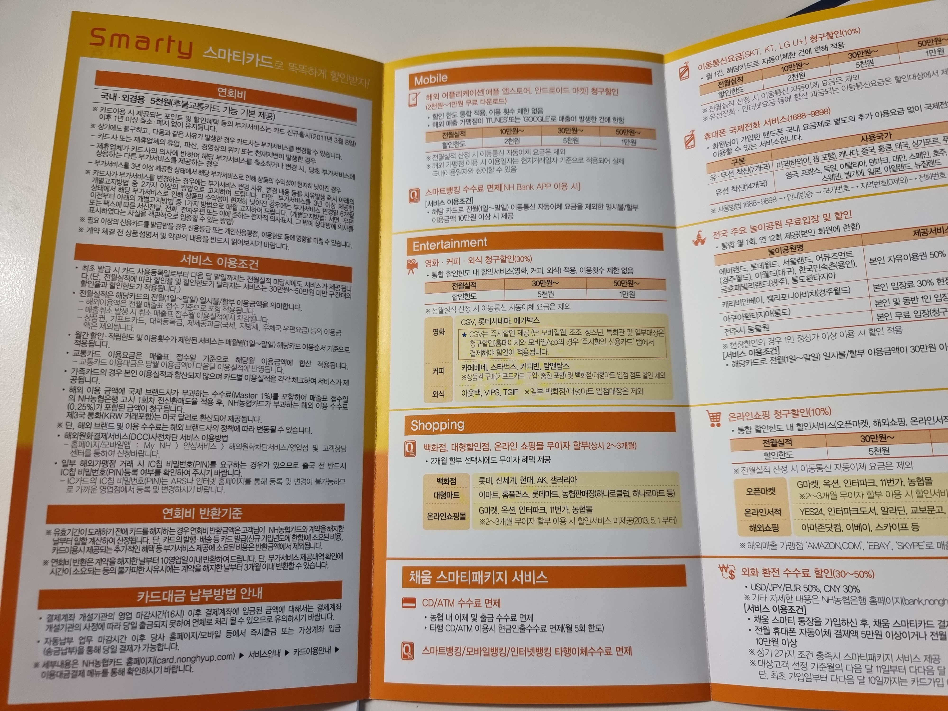 지금 생각해봐도 정말 10년전의 저를 칭찬해주고싶네요. 그때 농협 직원분이 추천하는 카드를 무시하고 스마티카드로 선택하였었거든요. 당시에 추천해주셨던 카드는 적립이 좀 많이되는 카드였던걸로 기억하는데, 적립보다 스마티카드의 혜택이 압도적으로 더 좋습니다.