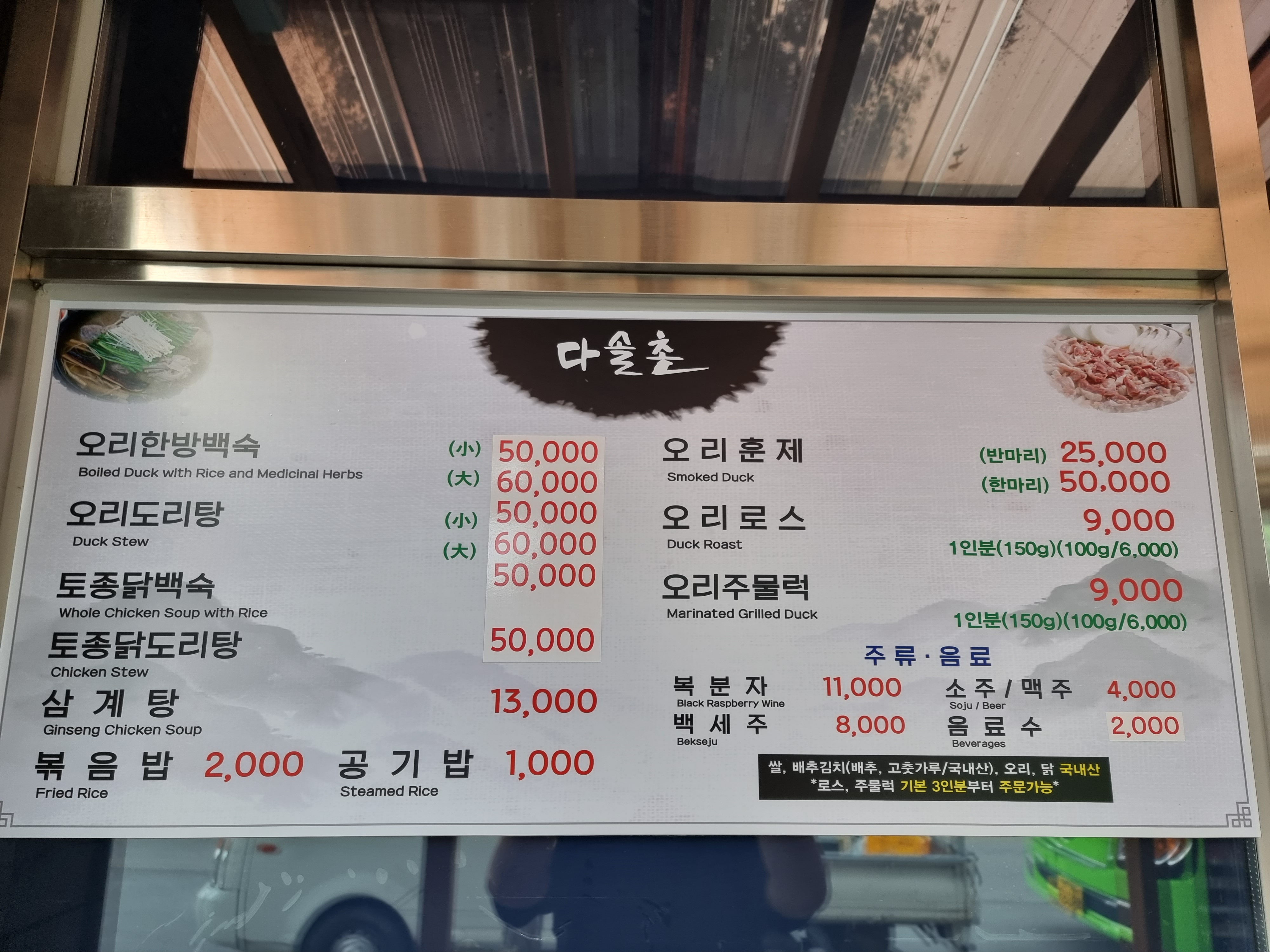 오리훈제랑 오리로스, 오리주물럭도 있으니 참고하세요. 제일 메인 메뉴는 오리한방백숙입니다.