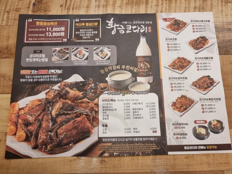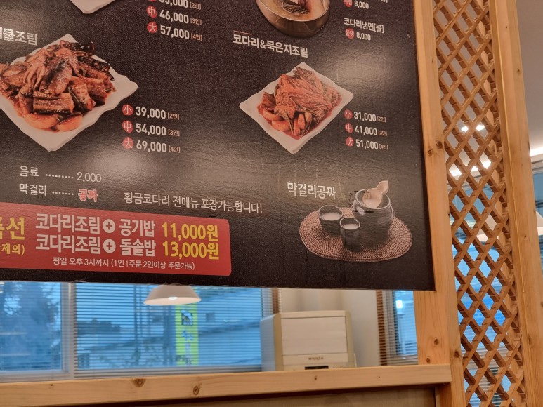 메뉴판. 뭐 이것저것 있는데 제일 메인이라고 할 수 있는 코다리 시래기 조림으로 주문하였습니다. 밥은 따로 시켜야하냐고 물어보니 그렇다고해서 밥은 따로 시켰습니다.