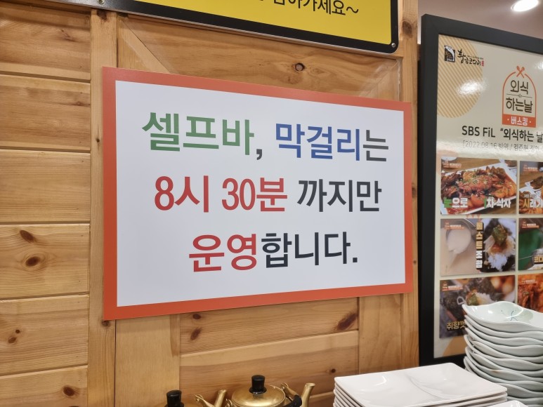 셀프바랑 막걸리 리필은 8시 30분까지만 운영한다고 합니다. 솔직히 막걸리는 배불러서 많이 못먹지 않나요...?