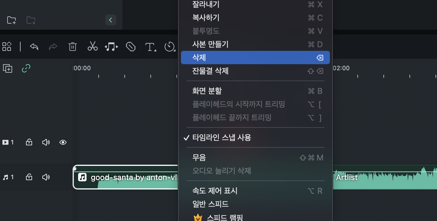 잘라진 클립에서 이제 불필요한 부분, 삭제할 부분을 마우스 오른쪽 클릭 후 삭제 버튼을 눌러 삭제하면 됩니다.