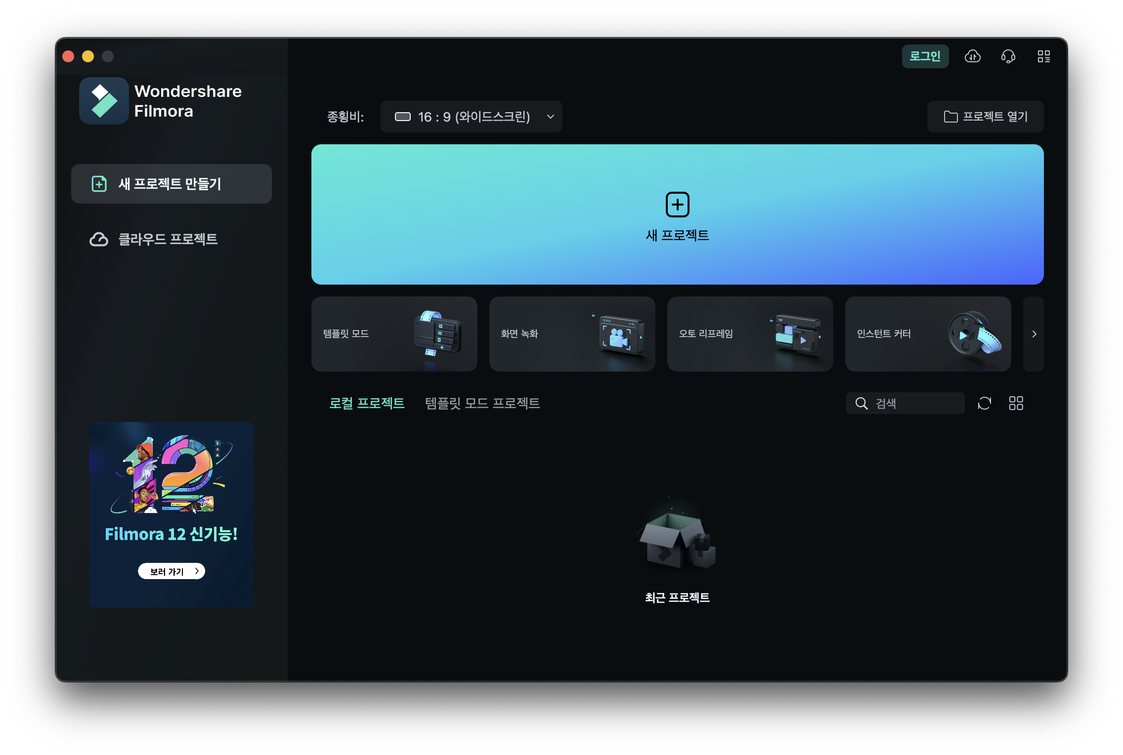 영상편집과 마찬가지로 음악편집하기, 그리고 mp3자르기를 하려면 우선 프로젝트를 만들어야합니다. 필모라12를 실행한 후 새 프로젝트 버튼을 눌러서 프로젝트를 생성해줍니다.