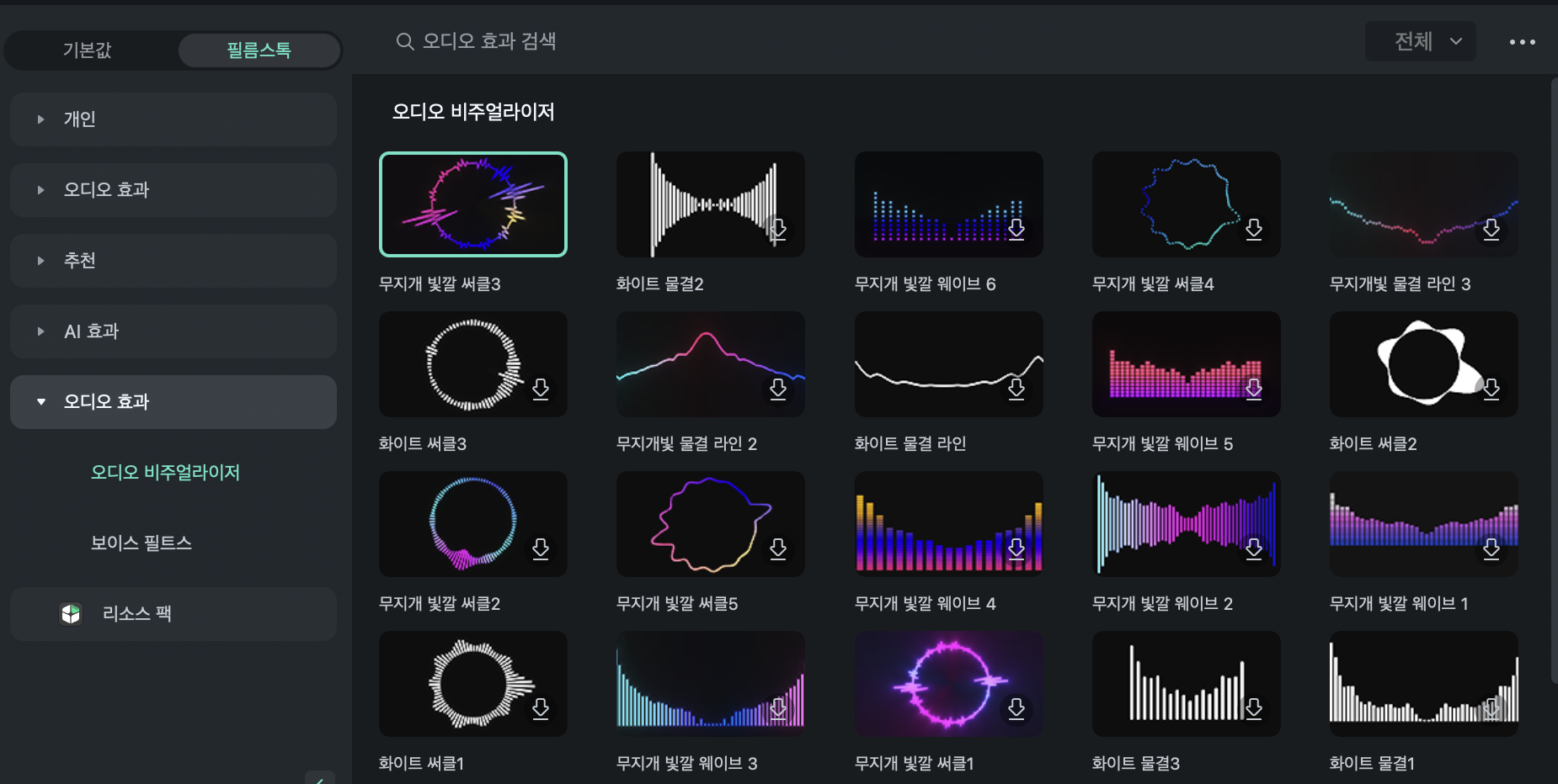 전문가용 프로그램에서는 이러한 오디오 비주얼라이저가 기본 프로그램에 포함되어있지 않으며 별도의 플러그인을 구매하거나 다른 사람이 공유해둔걸 받아서 써야하는데 사용법도 어렵고 가격도 비싸며 잘 작동하지 않는 경우도 많습니다. 필모라12에는 간편하면서도 잘 작동하는 오디오 비주얼라이저를 제공합니다.