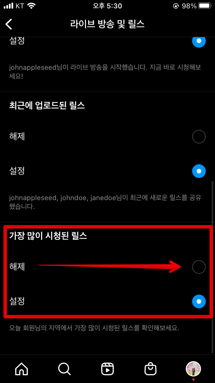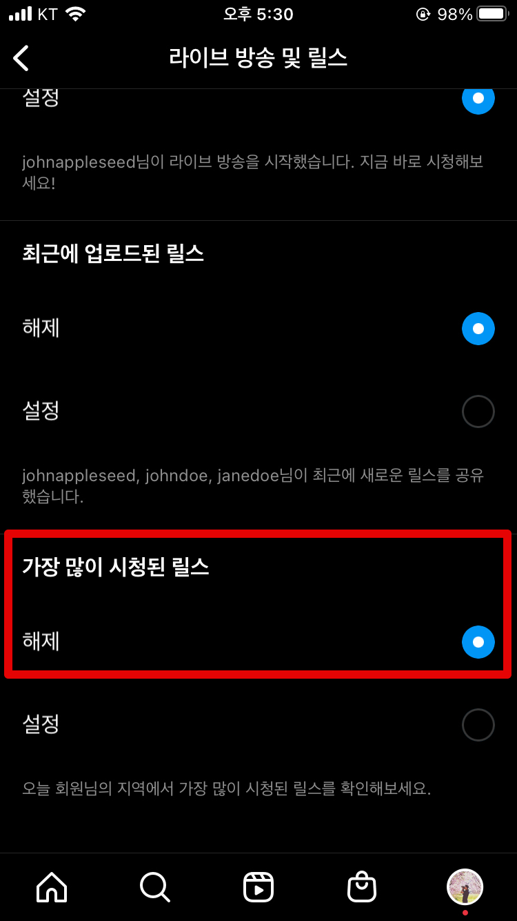 그런 다음 [라이브 방송 및 릴스]를 클릭하시고요. 아래쪽으로 좀 내리시면 [가장 많이 시청된 릴스]항목이 있는데 이 부분을 설정에서 해제로 바꿔줍니다. 그러면 다음날부터 알림 안옵니다. ㅎㅎ