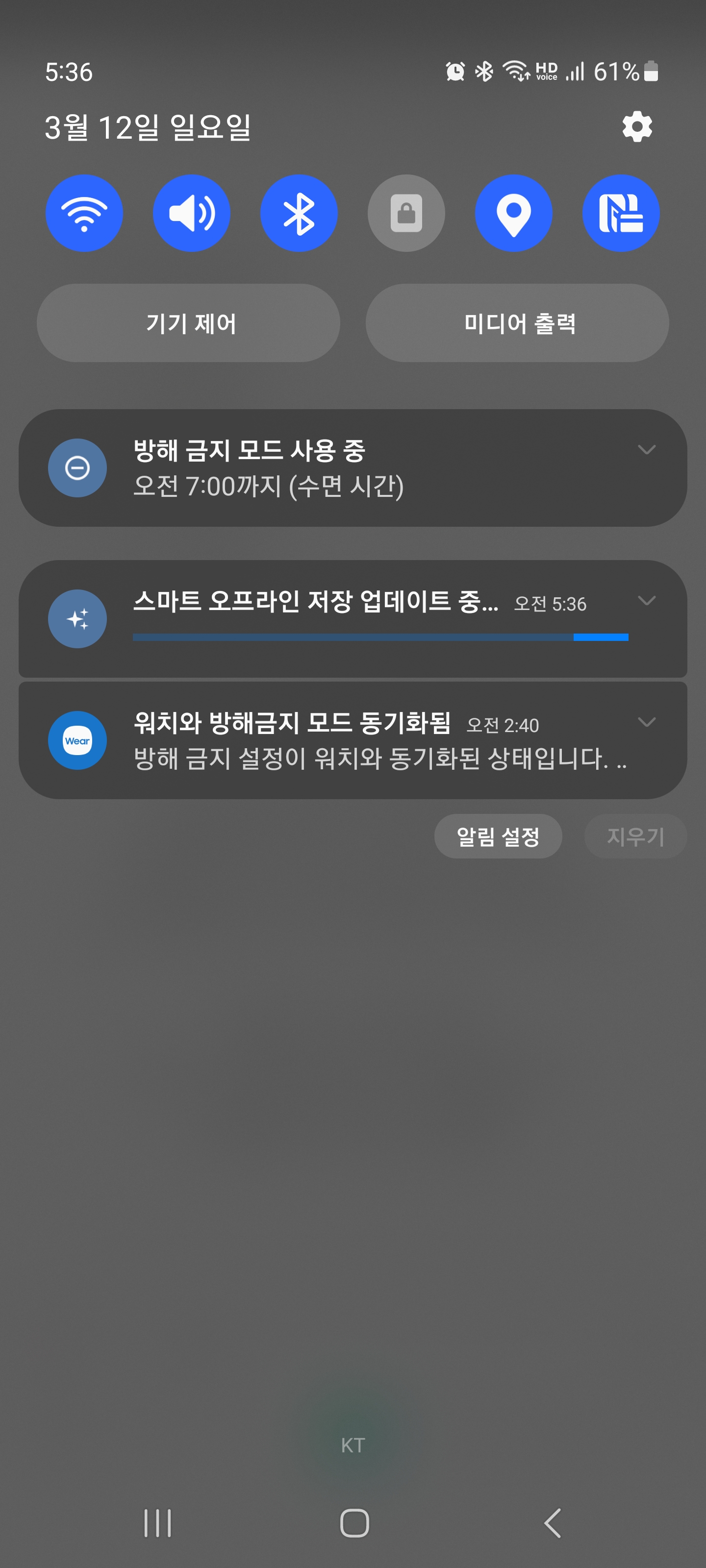 이전까지는 그런일이 없었는데 며칠전부터 갑자기 어느 순간에 '스마트 오프라인 저장 업데이트 중...' 이라고 뜨면서 유튜브 뮤직에서 계속해서 노래가 다운로드 되더라고요. 별도로 설정을 만진적도 없었는데 말이죠.