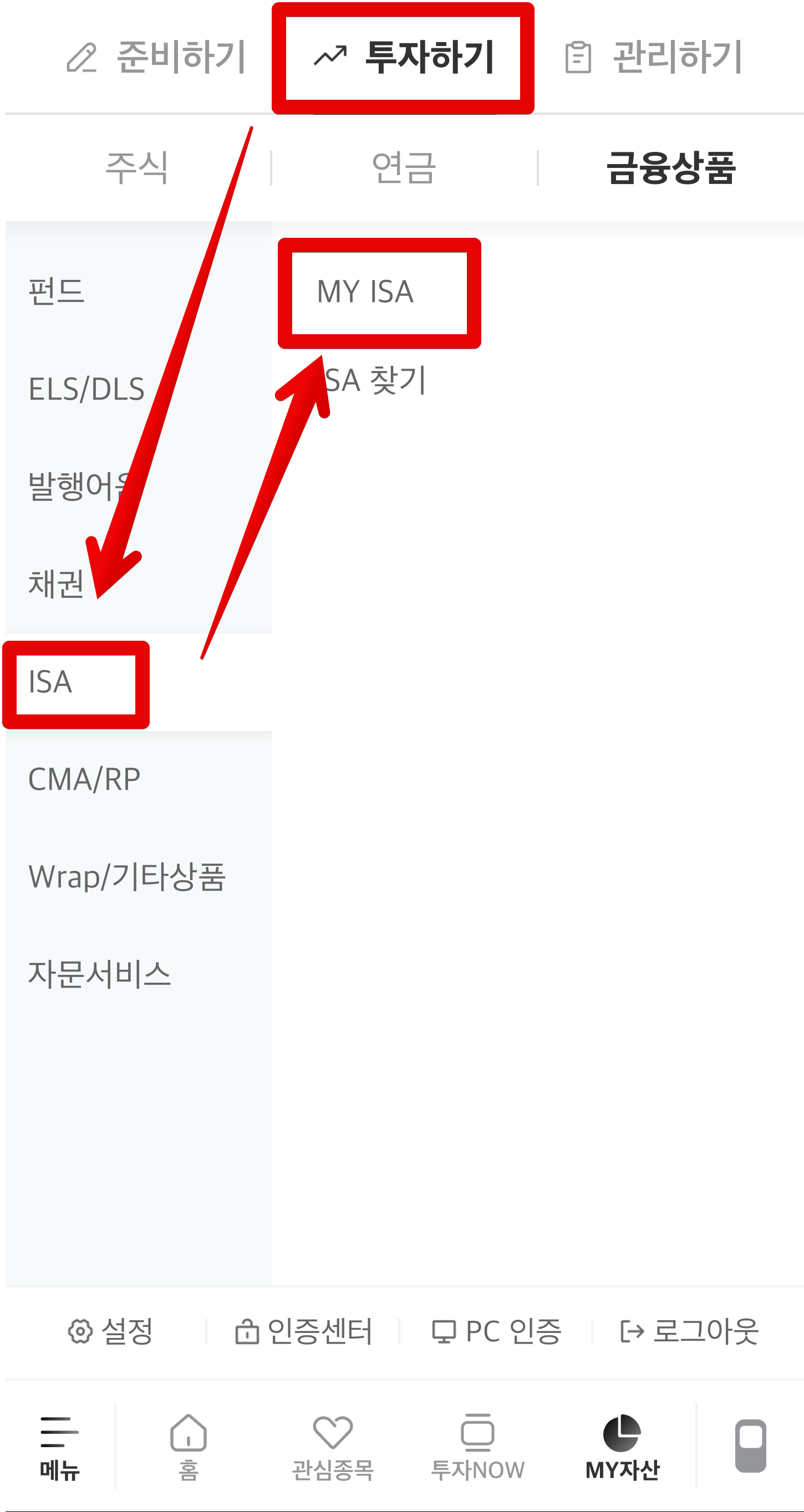 스마트폰 앱에서 미래에셋증권으로 들어가줍니다. 그런 다음 메뉴에서 [투자하기]를 클릭하고 옆에 나오는 메뉴에서는 [ISA]를 클릭하세요. 그런 다음 [MY ISA]를 클릭합니다.