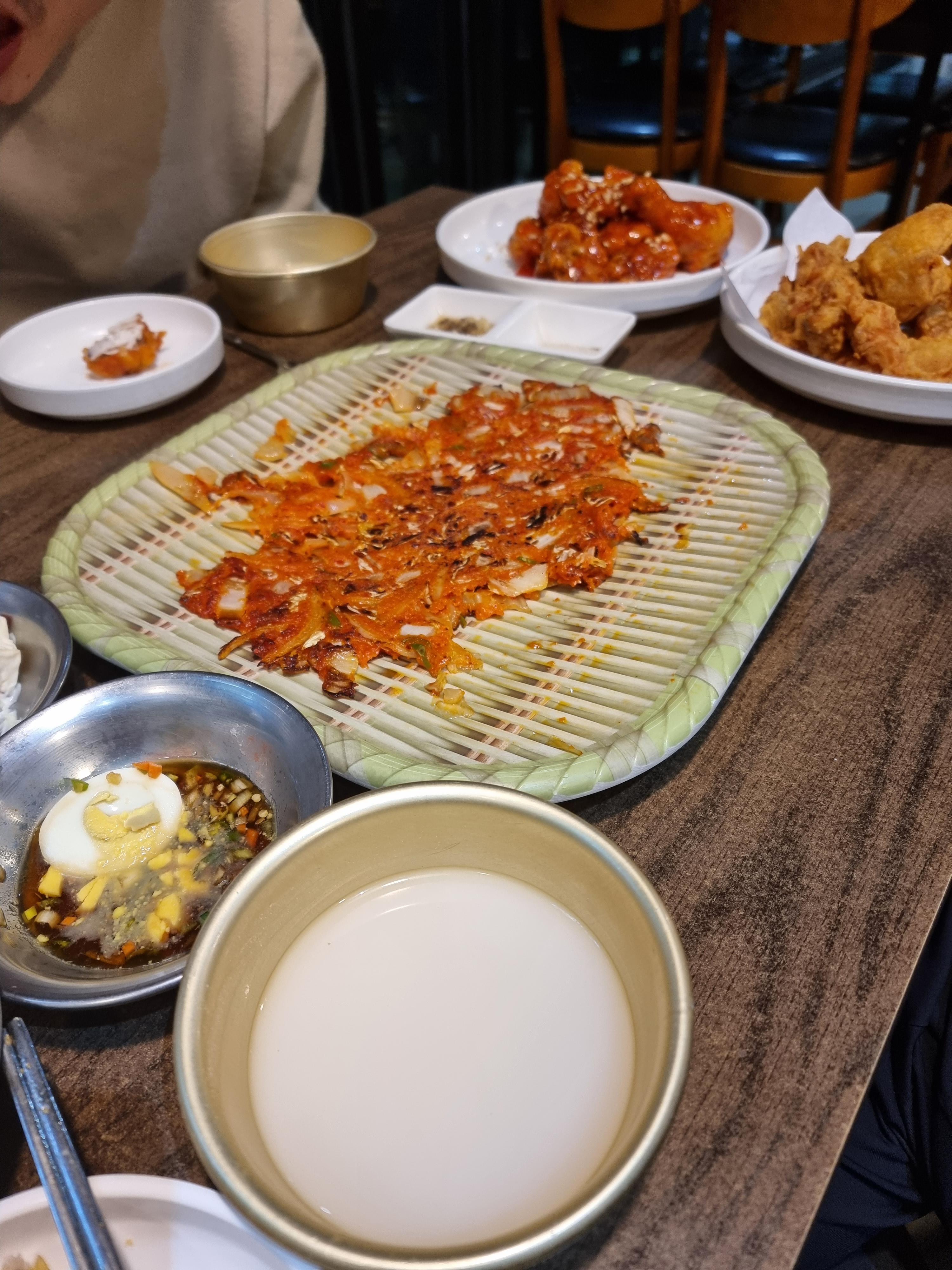 이번에는 술을 막걸리로 고르게 되었네요. 막걸리 없는줄 알았는데 알고봤더니 있더라고요 ㅋㅋ 회곡 막걸리로 골랐습니다. 김치전 시켜봤는데 얇은 스타일이고 맛 괜찮은 편이에요. 약간 안동 옛날 방식의 '떡'이라고 부르는 그런 전 스타일은 아니고 무난한 술집 전 스타일입니다. 김치전 시켰는데 김치도 많이 들었고 맛있었어요 ㅎㅎ 굿굿