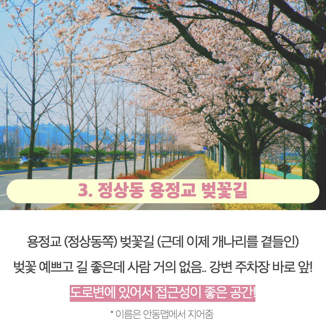 정상동쪽 용정교 강변 길에도 예쁜 벚꽃이 있고 사람이 적어서 추천되고요.