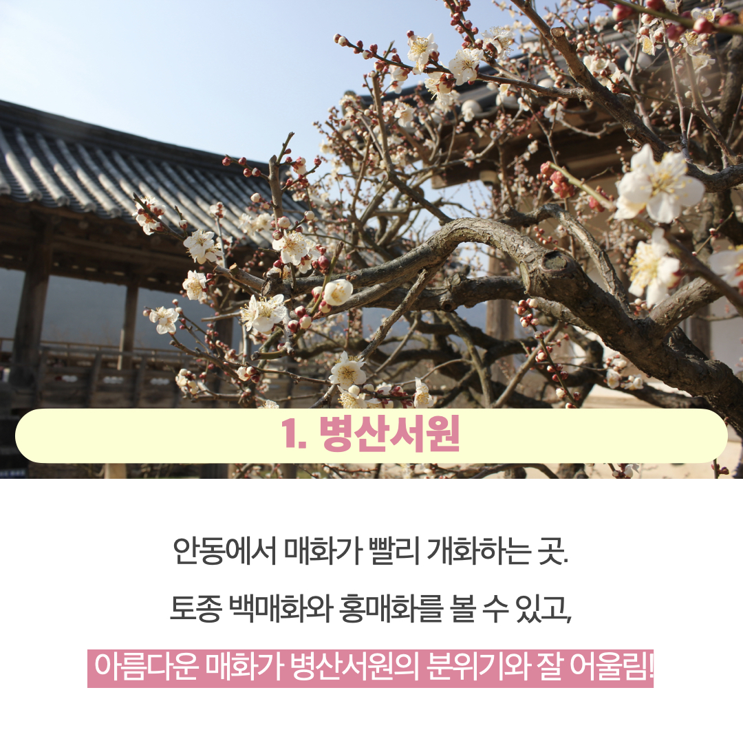 첫번째 추천 장소는 병산서원입니다. 현재 세계유네스코문화유산인 공간인데요. 토종 매화를 볼 수 있는 곳으로 봄 여행지로 추천합니다.