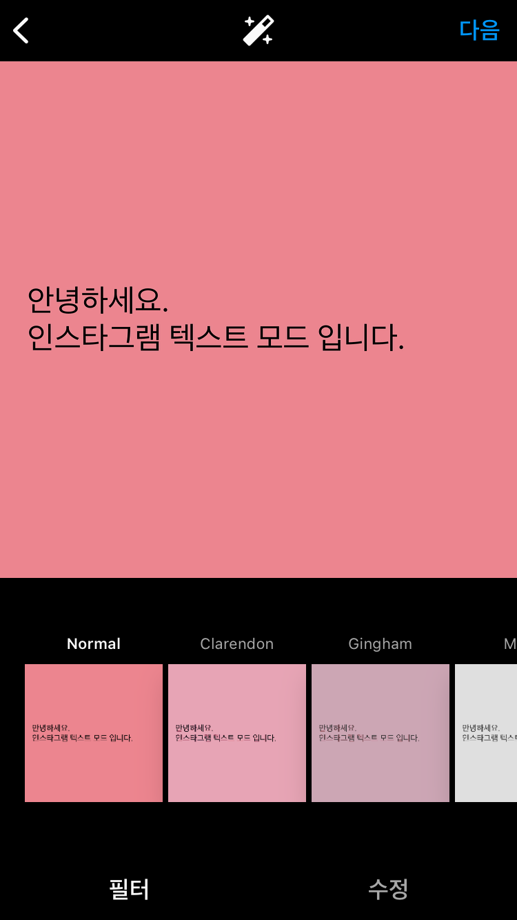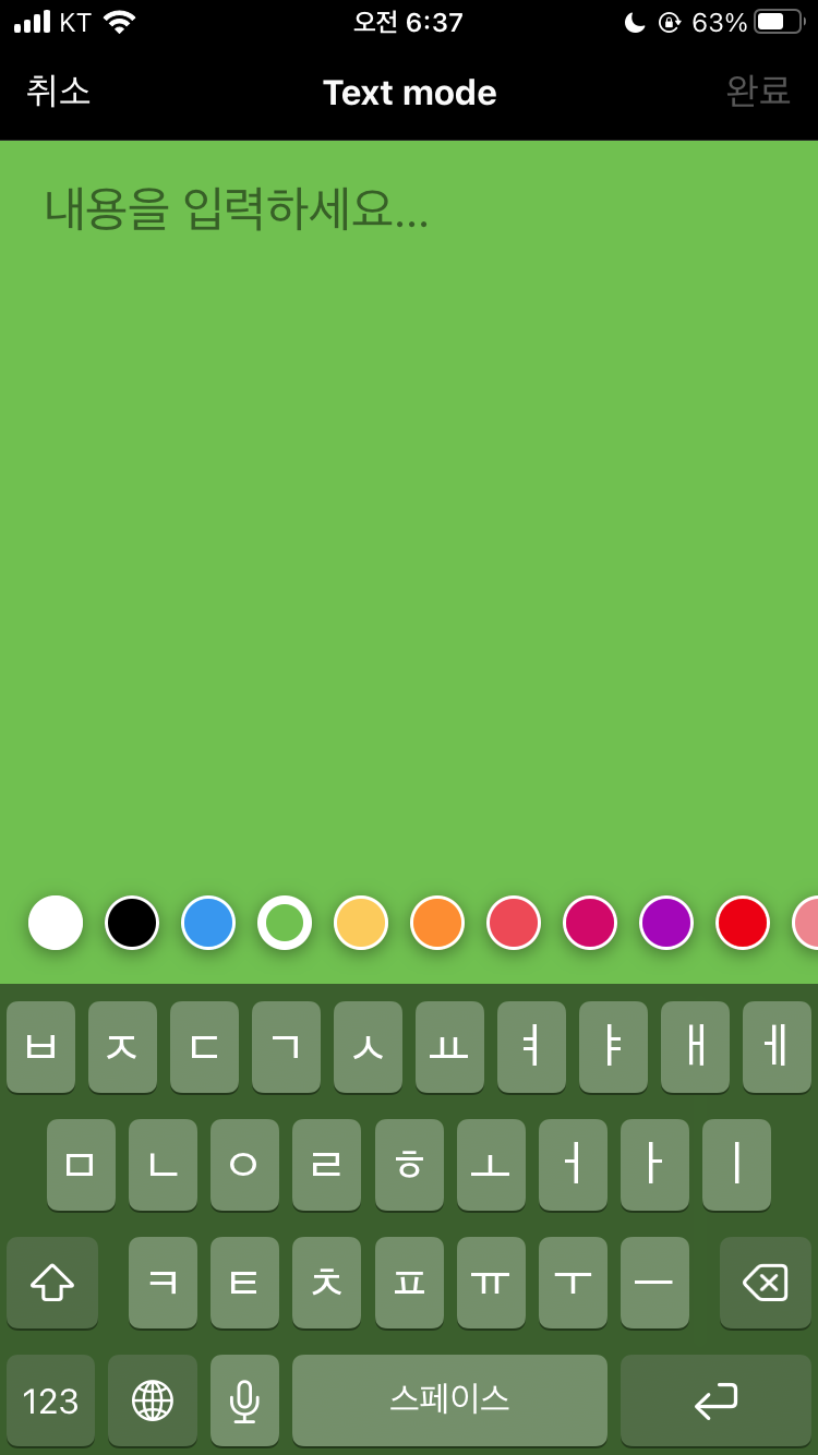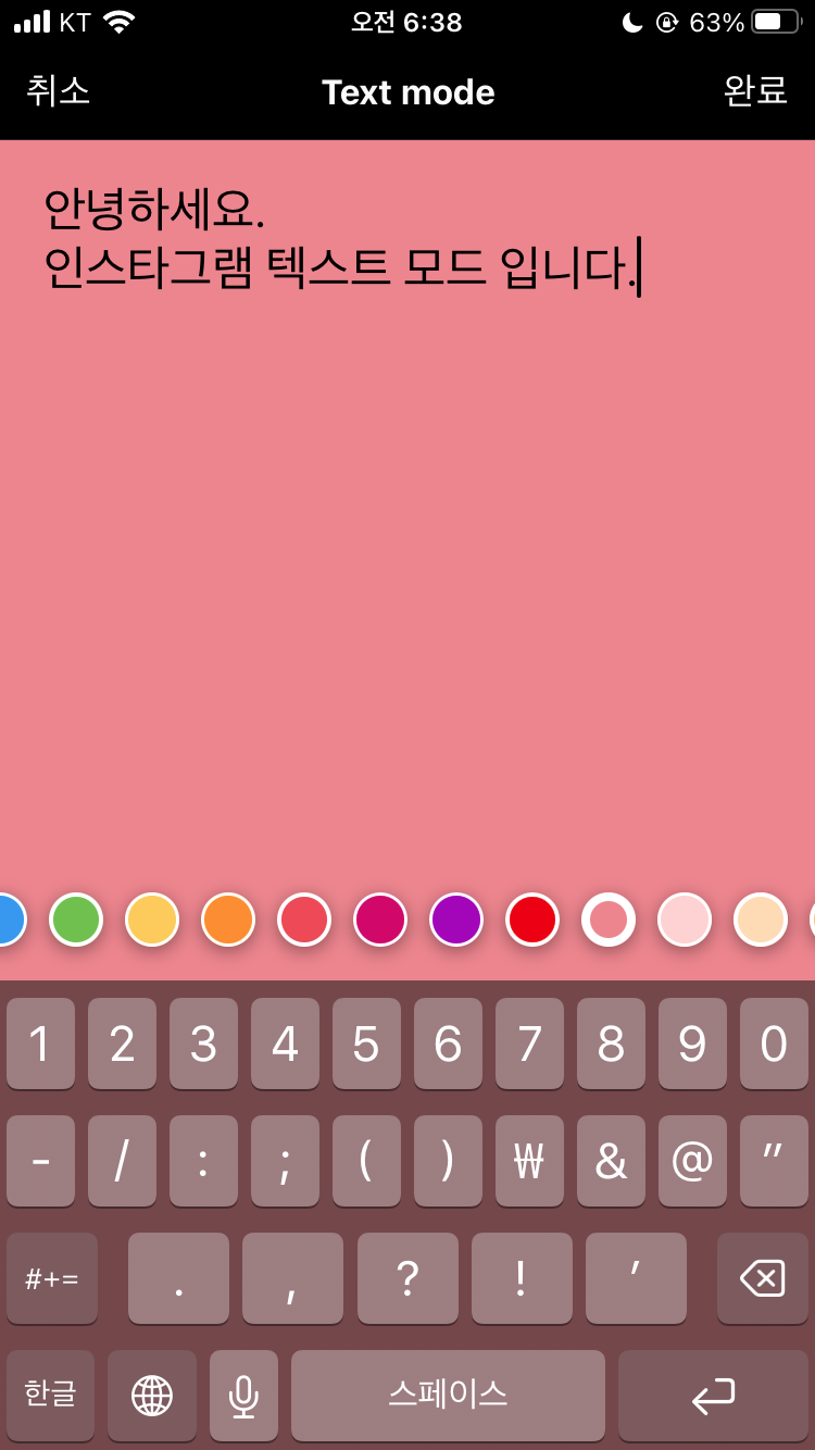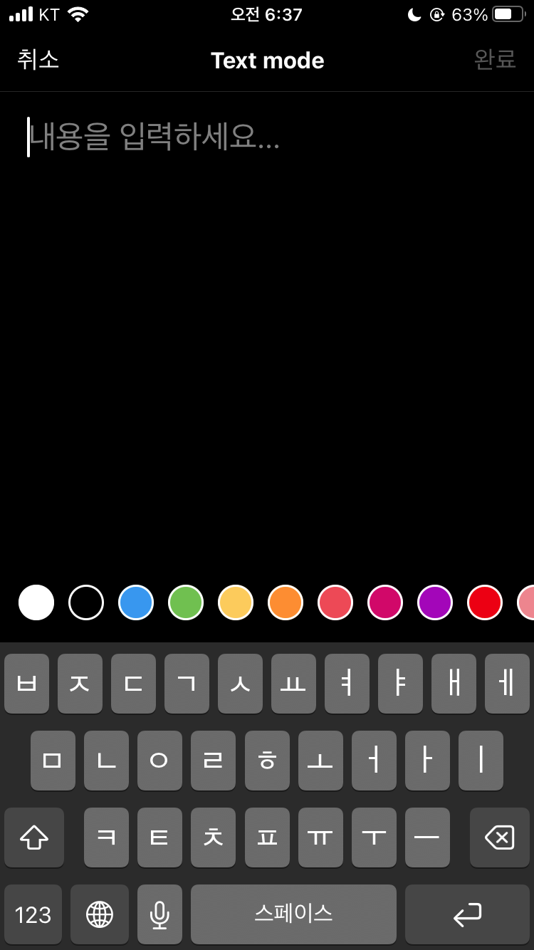 바로 글을 쓸 수 있는 모드가 나타납니다. 디자인은 좀 단순한 편인것 같은데요. 배경색을 고를 수 있도록 해두고 있고 그냥 플랫한 배경에 글자만 쓸 수 있도록 돼 있습니다. 여기에 여러가지 인스타그램 기능들, 예를들어 친구 태그 기능 등을 추후에 이용할 수 있긴 한데... 그건 다른 이미지로도 가능한 것이므로 텍스트 모드 자체가 예쁜 디자인은 아닙니다. 간편하게 만들 수 있다는건 장점이고요.