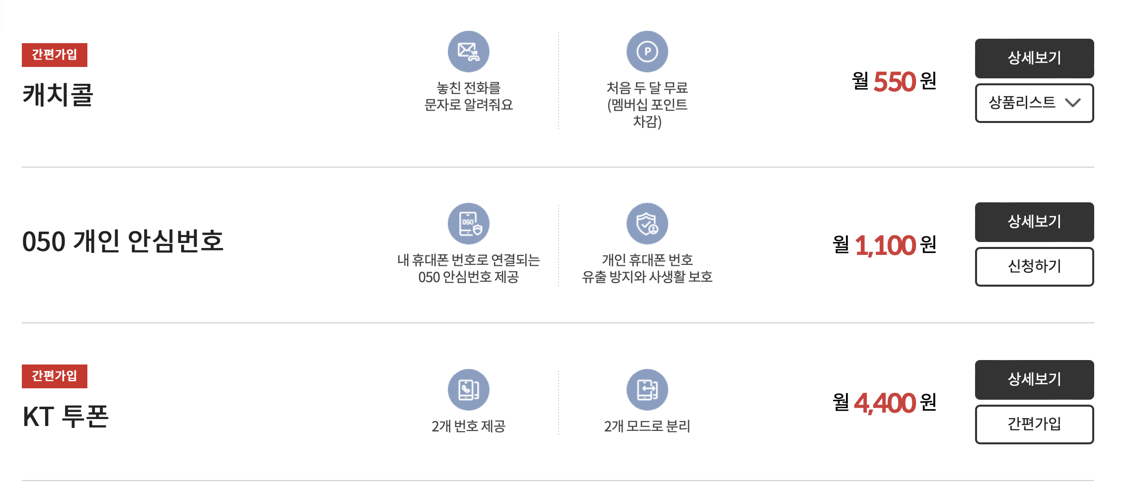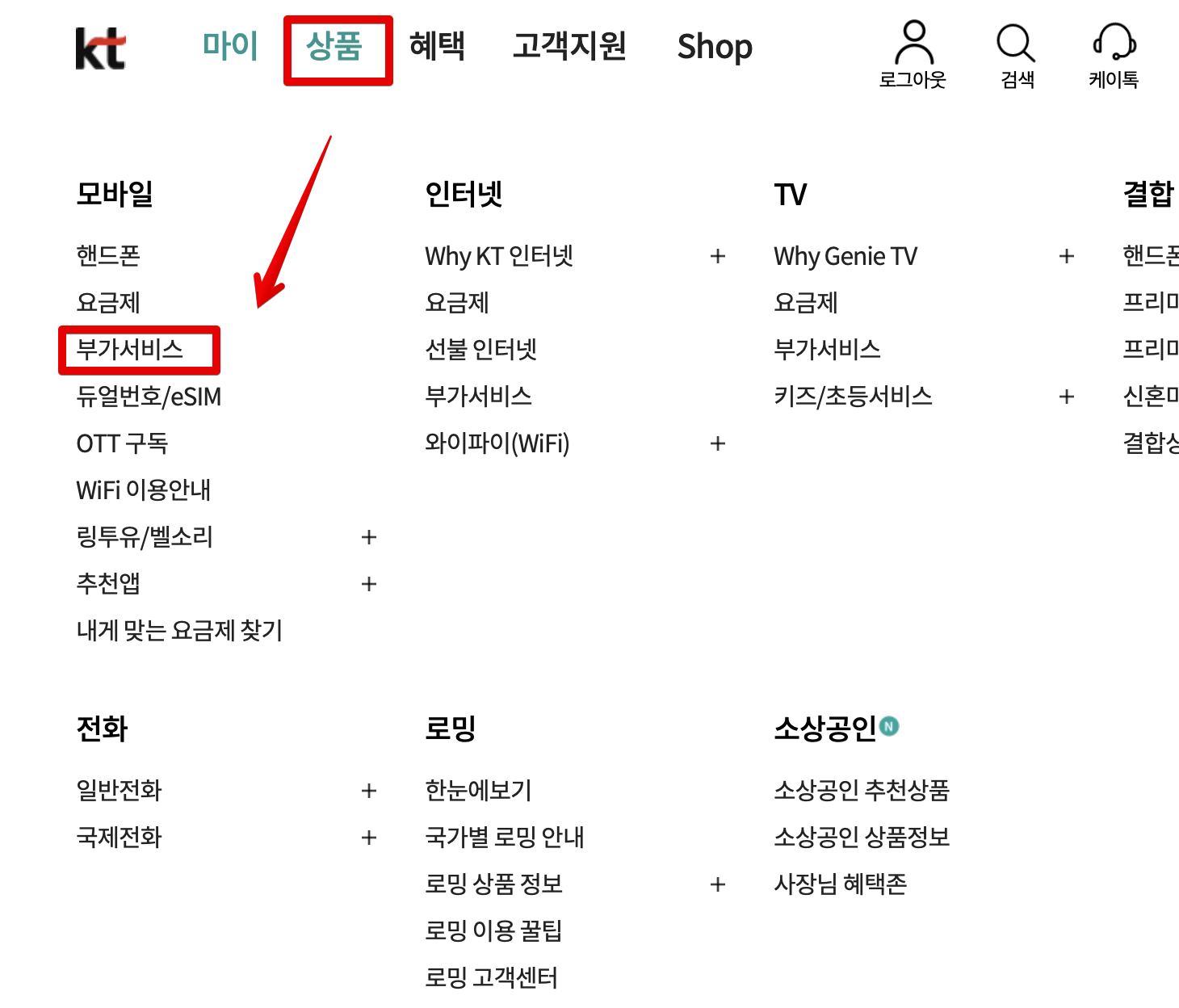 KT의 050 개인 안심번호 서비스는 KT 홈페이지 메뉴에서 [상품]에서 [부가서비스]로 들어가면 찾을 수 있습니다.