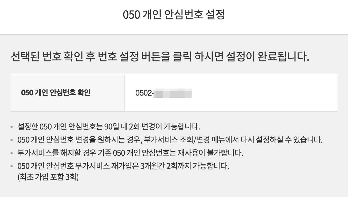 신청은 홈페이지에서 빠르게 끝났고요. 050 개인 안심번호 서비스가 가입 완료되면서 번호가 생성되었습니다. 앞으로는 이렇게 생성된 번호를 안내해서 연락을 받으면 되는데요.