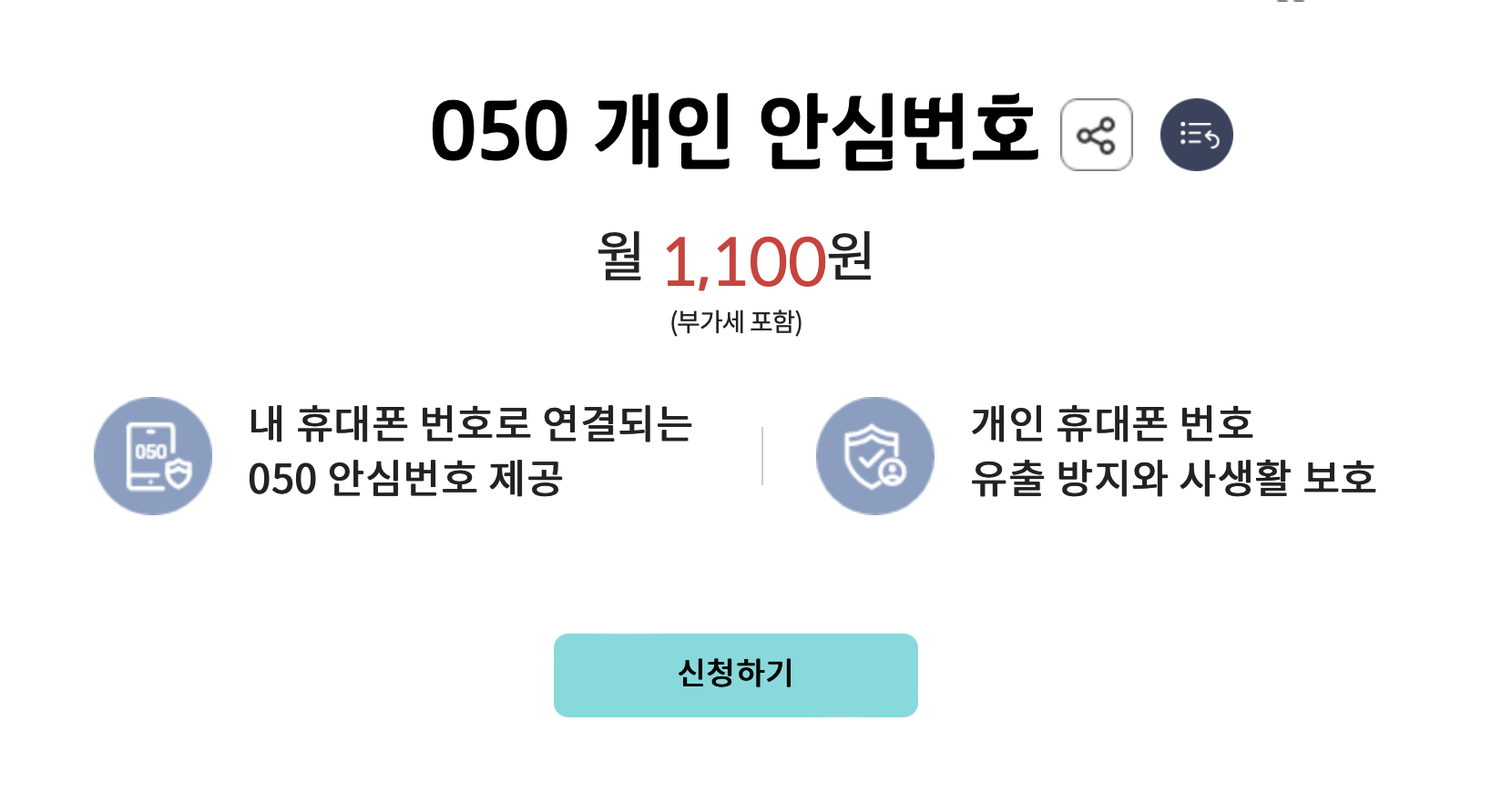 조금 밑으로 내리시면 050 개인 안심번호 신청하는 창이 나옵니다. 요금은 한달에 1100원이며 부가세 포함 금액입니다.