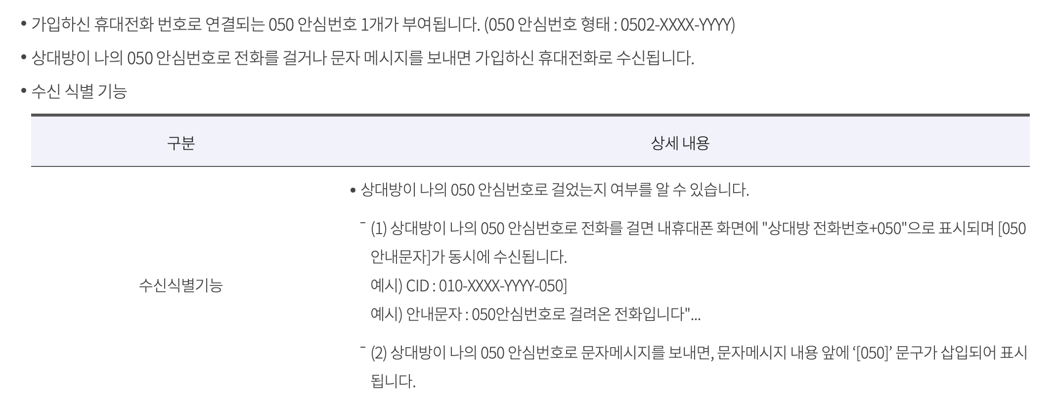 수신식별기능이 있습니다. 050 번호로 전화가 오게되면 상대방 전화번호 뒤에 050이 붙어서 식별 가능하도록 해주고 있으며 안내문자가 함께 온다고 합니다. 그래서 어떤 전화번호로 전화가 걸려왔는지 확인이 가능합니다. 다만 이때에도 해당 번호로 문자를 보내거나 전화를 걸어버리면 기존 번호로 전송되므로 기존 번호가 노출됩니다. 이때에는 꼭 기존 번호가 노출되어도 관계없는지 파악한 후 진행하는게 좋겠고요. 만약 발신때에도 번호가 필요하다면, 050 개인안심번호가 아니라 KT에서 제공하는 듀얼번호 서비스를 이용해야합니다.