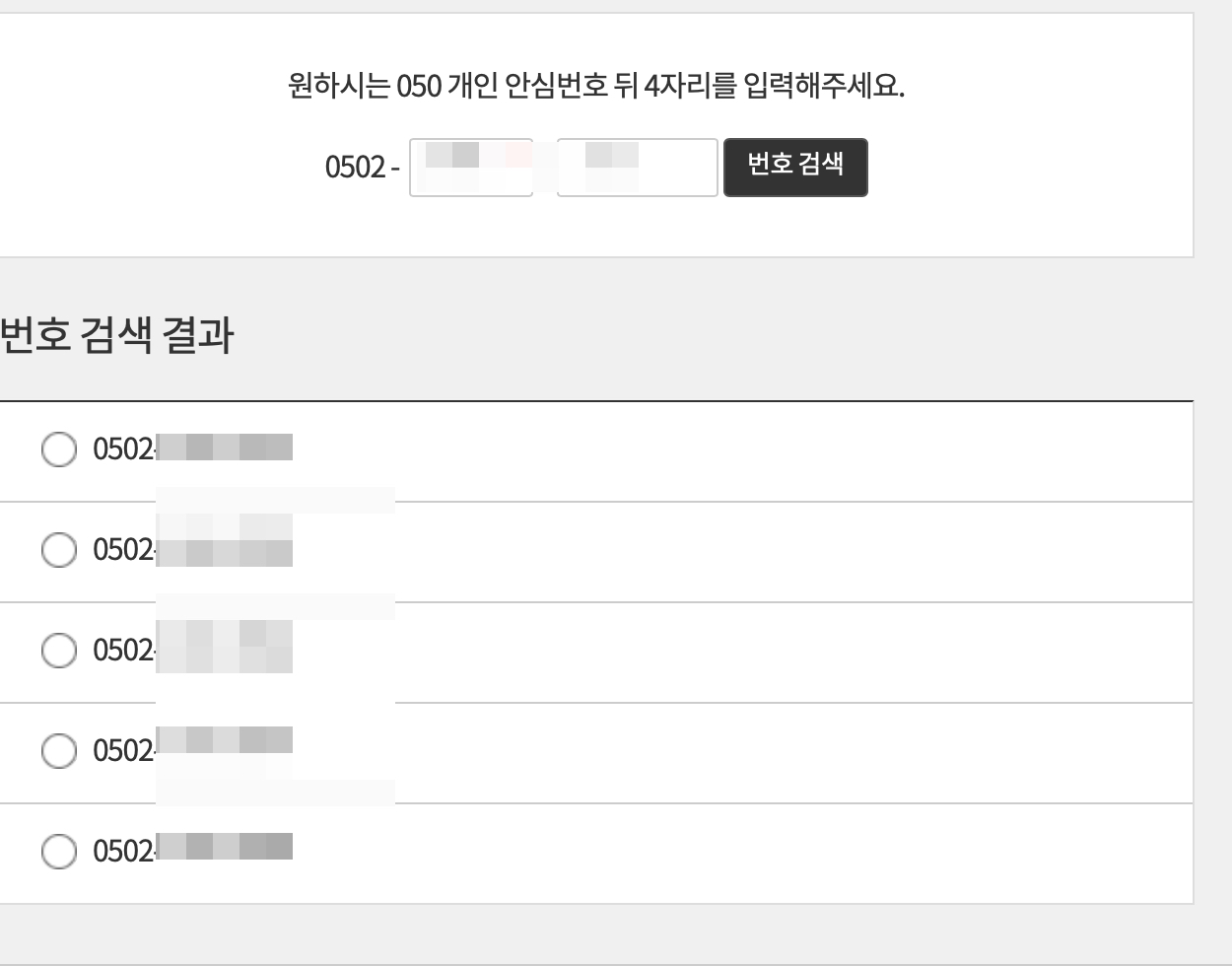 개인안심번호를 신청할 때 끝자리 4자리를 선택할 수 있다고하여 해보았습니다. 아무래도 요즘에는 050 개인안심번호 사용자가 많았던지 딱 원하던 일치하는 번호는 나오지않고 비슷한 번호가 아래쪽에 추천되었습니다.