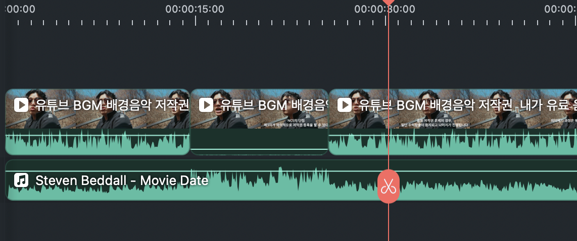 오디오 더킹이 완료되었습니다. 목소리가 있는 부분에서는 배경음악이 작게 들리며, 목소리가 없는 부분에서는 배경음악이 크게 들리는 자연스러운 영상 오디오 효과를 손쉽게 만들 수 있었네요. 조금 뚝 끊어지는 느낌이 든다면 페이드인과 페이드아웃을 추가할 수도 있겠습니다. 직접 하나하나 키프레임을 넣지 않고도 이렇게 쉽게 오디오 더킹을 만들 수 있는점이 필모라12의 장점입니다.